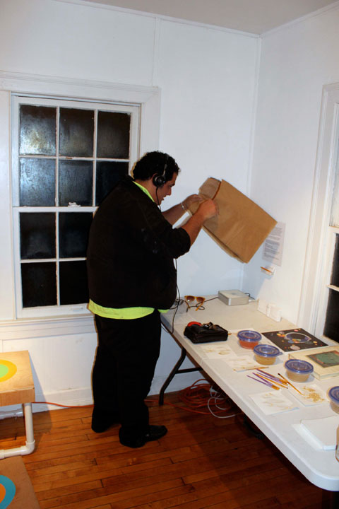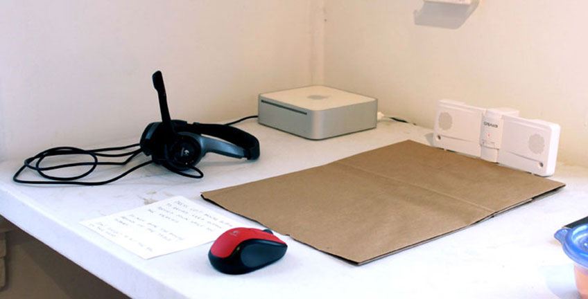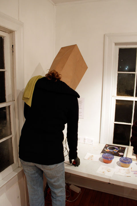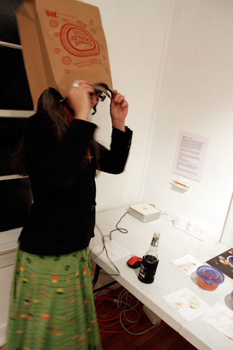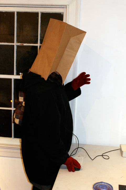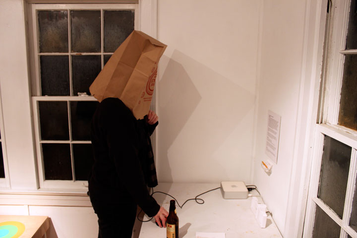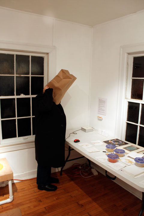 People put on a microphone headset, put a paper bag over their heads, then record their innermost thoughts about cats, dogs, cat owners, or dog owners. The software alters their voices for the purposes of anonymity, and plays the messages at random times throughout the show. The installation acts as a confessional, providing for the free public release and interchange of feelings between cat people and dog people, hopefully mediating the hostile emotions that often exist between the two factions.