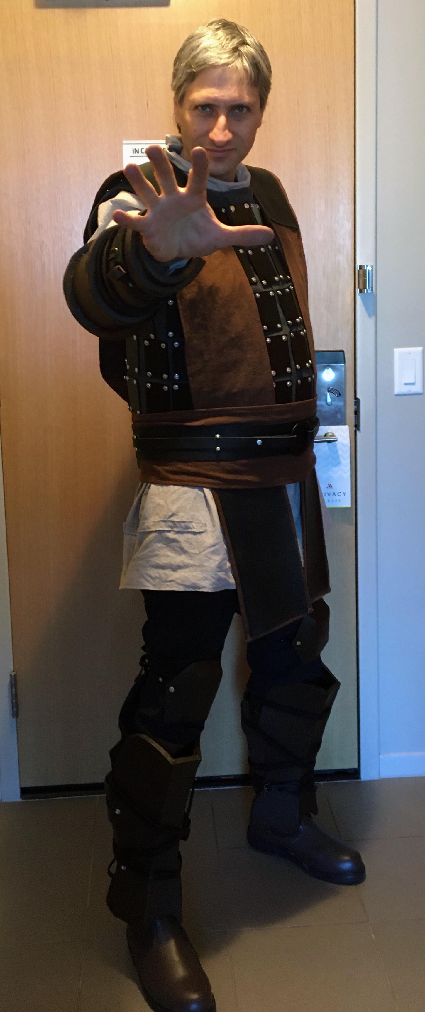 It’s a very edge-lordy costume, which is not normally my thing, but when your character is based on other characters and a milieu from ’90s comics, you’re going to have a lot of straps (most not even easily visible in these pics; for instance there are completely pointless straps wrapped around my right thigh). And straps = edgelord.