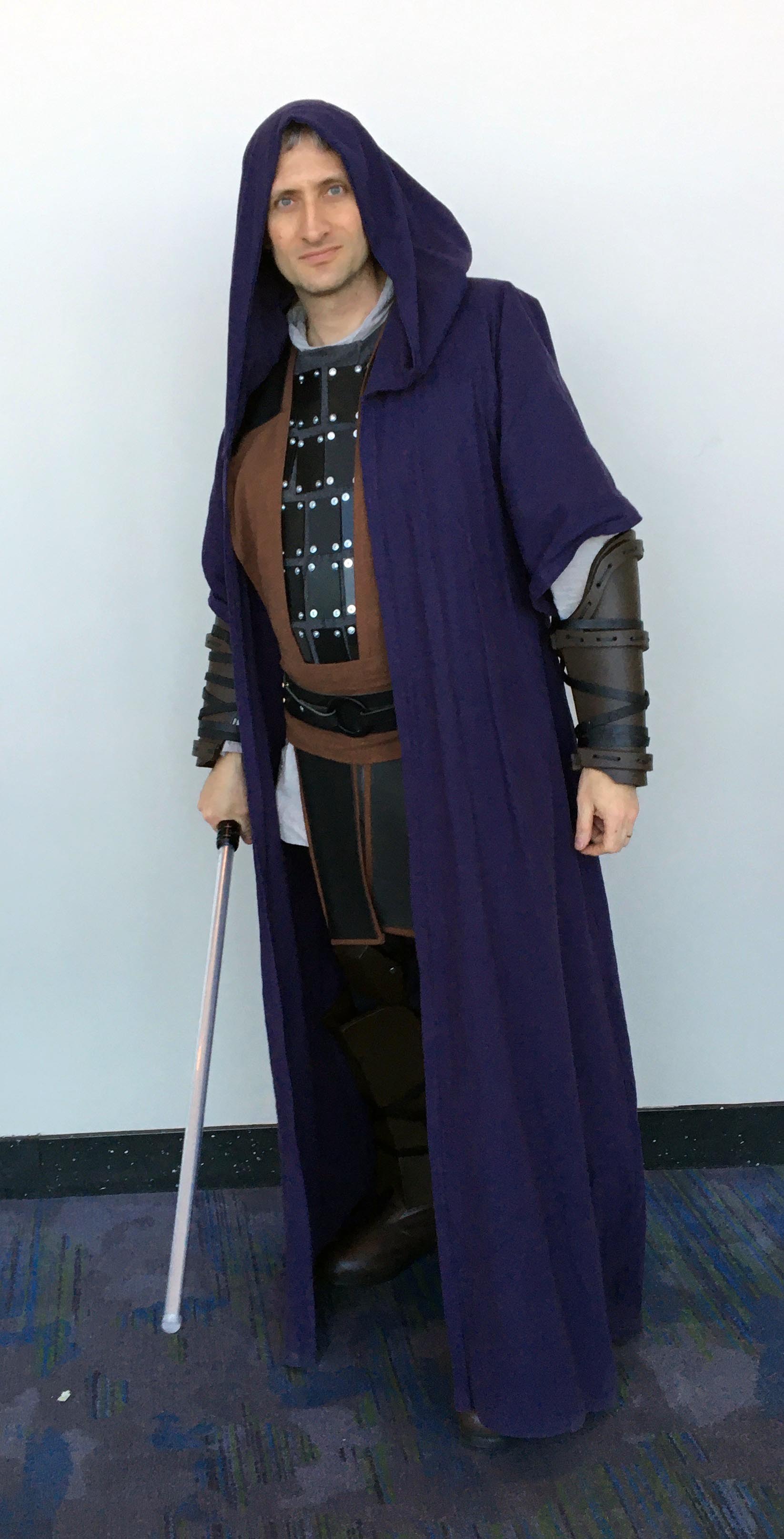 The characters that Amet Risu would have worked with, Exar Kun and Qel-droma, died in 3996 and 3186 BBY, respectively. I also based parts of this costume on clothing and armor styles that came from the Knights of the Old Republic comics (like Zayne Carrick, born 3982 BBY) and the slightly-later Old Republic video games (~3650-81 BBY for Ven Zallow and Kao Cen Darach).