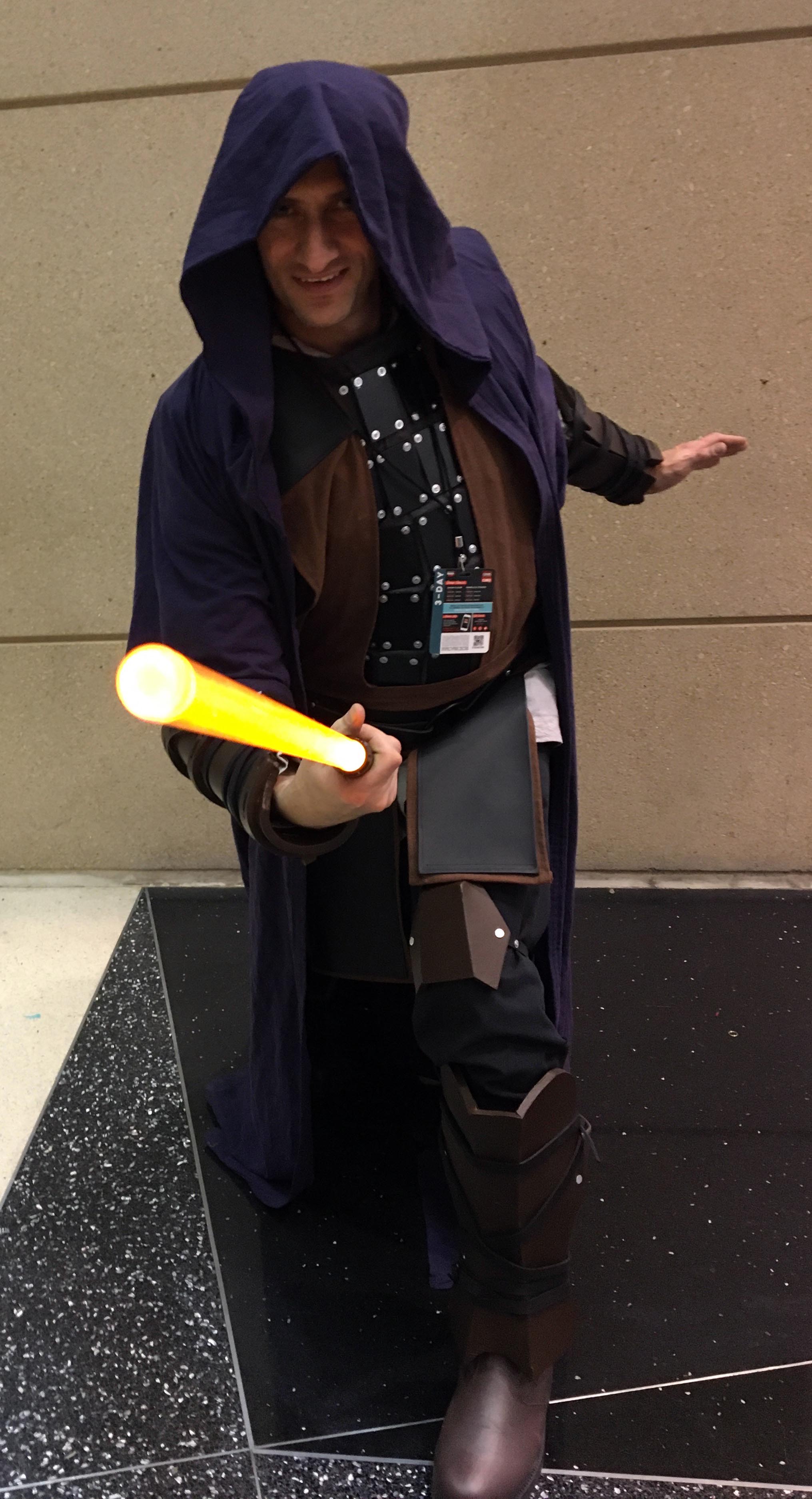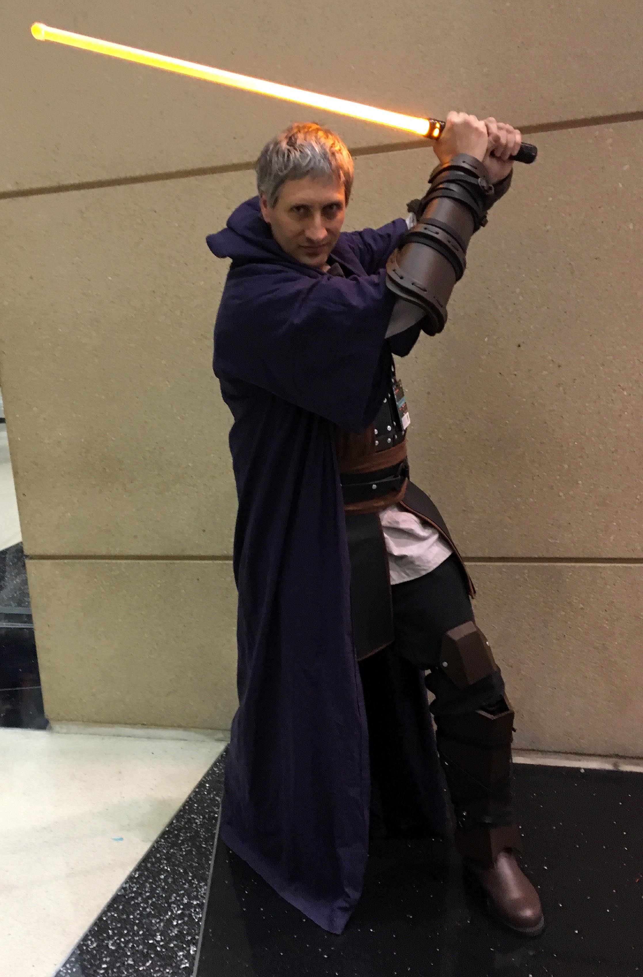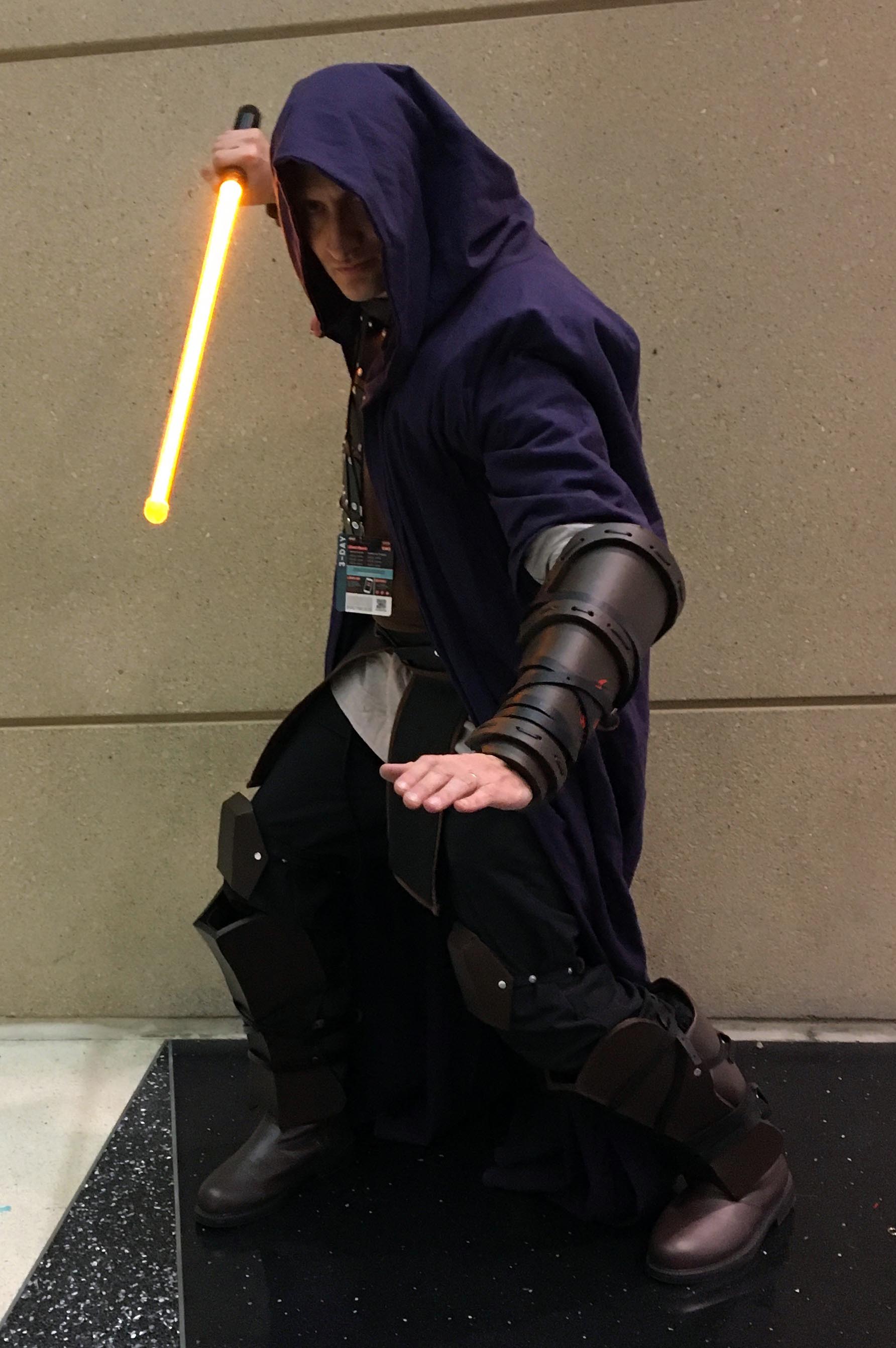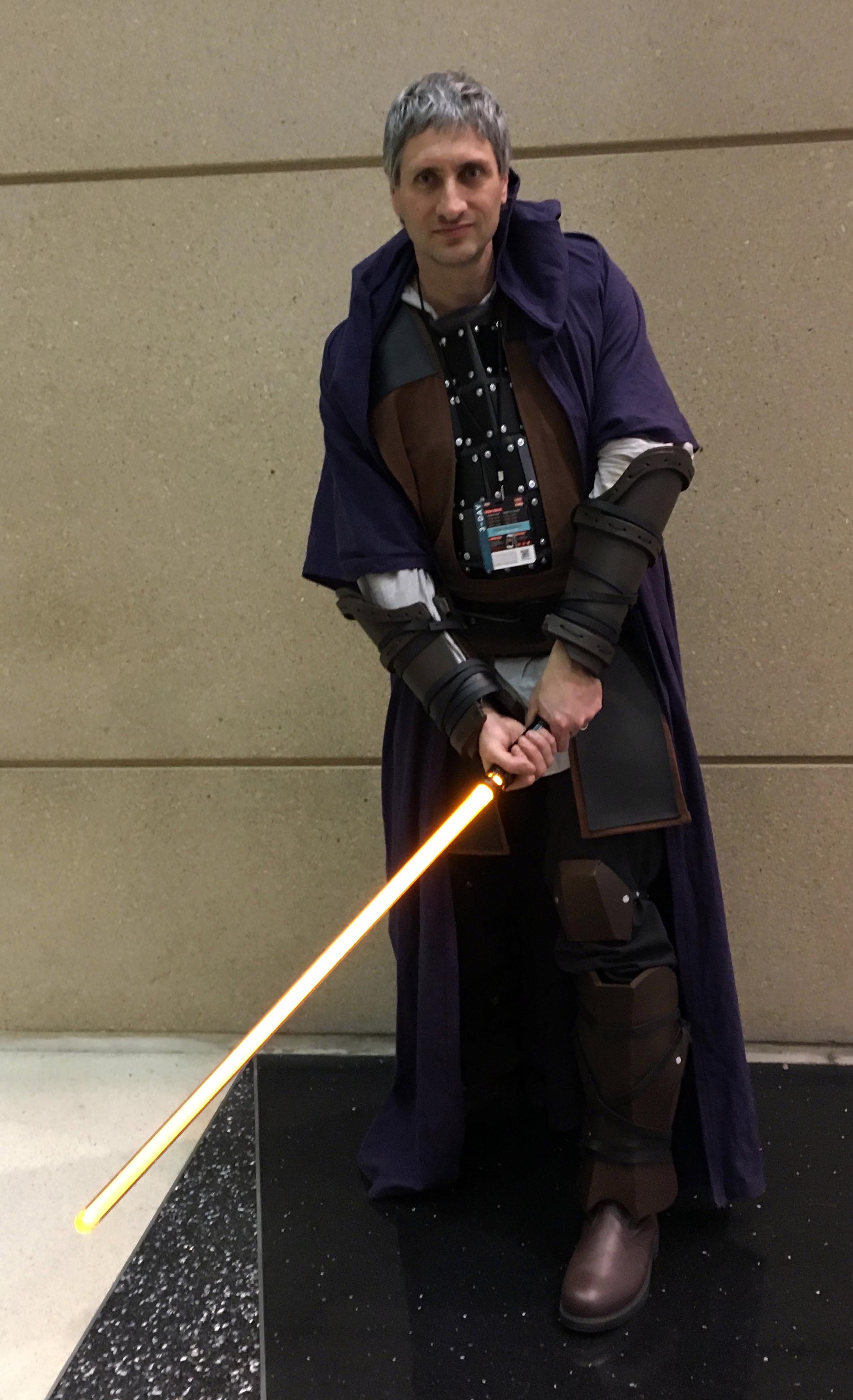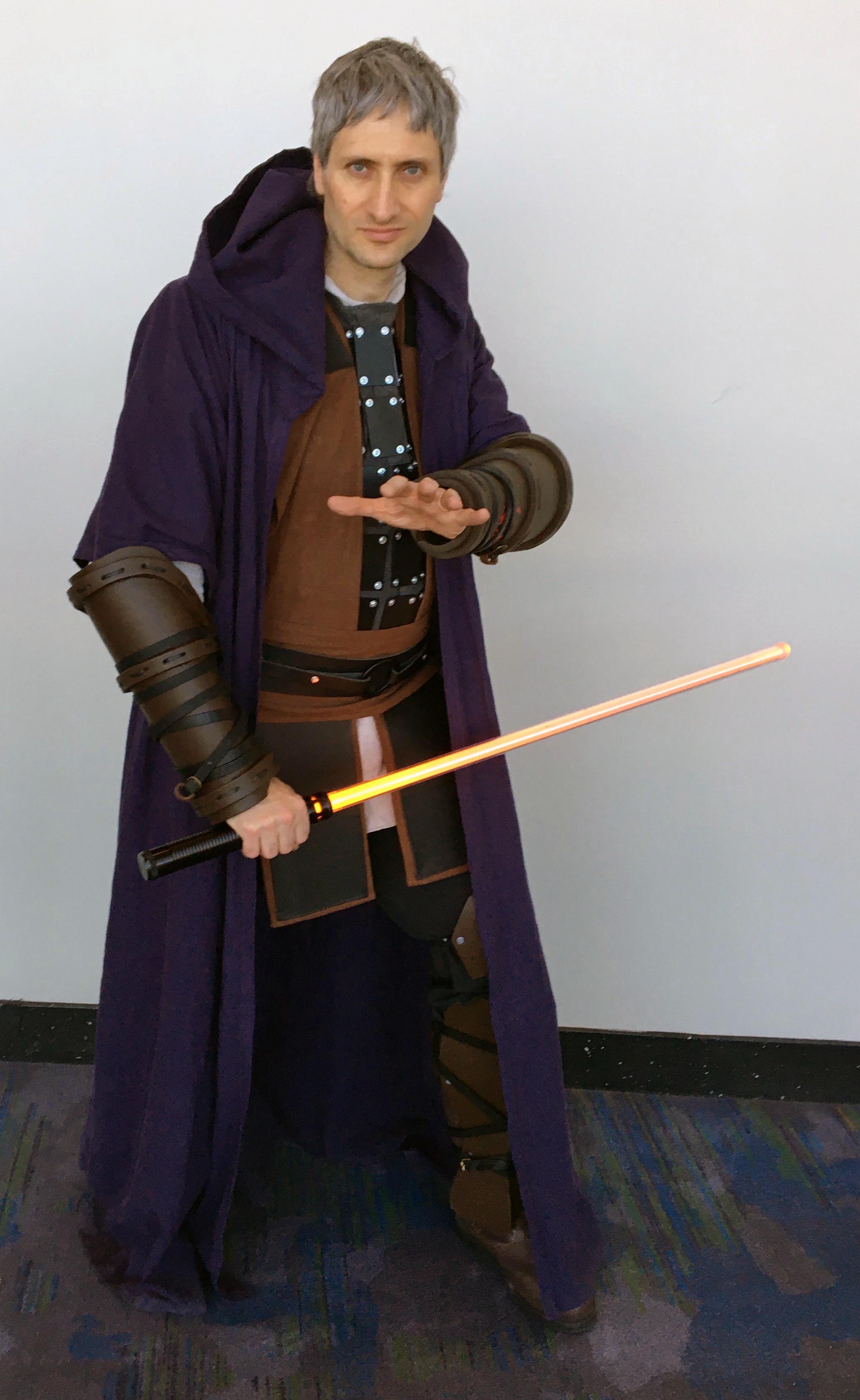 I tried to signal the fact that he’s a “Dark Jedi” of Qel-Droma’s ilk (i.e. not truly Sith, which would imply that he follows the principles of the Sith religion as written in its Code, as opposed to not believing in the Jedi Code and being open to using the dark side of the force) through the purple color of the robe and the use of browns rather than just blacks, plus the orange blade.