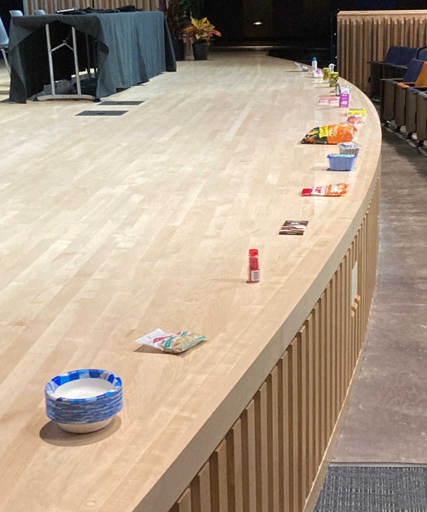 I provided 21 selections of food–20 for the audience plus one for myself–and lined them up along the edge of the stage. Each food package included many small pieces of that food. I asked the audience to select which one I would eat and invited them to choose one for themselves. These foods included Cheetos-flavored popcorn, jalapenos, pickle slices, mushrooms, dark chocolate, Gushers, red hots, backberries, blueberries, sesame seeds, spray cheese, pepperoni, macademia nuts, pocky sticks, mashmallows, and more.