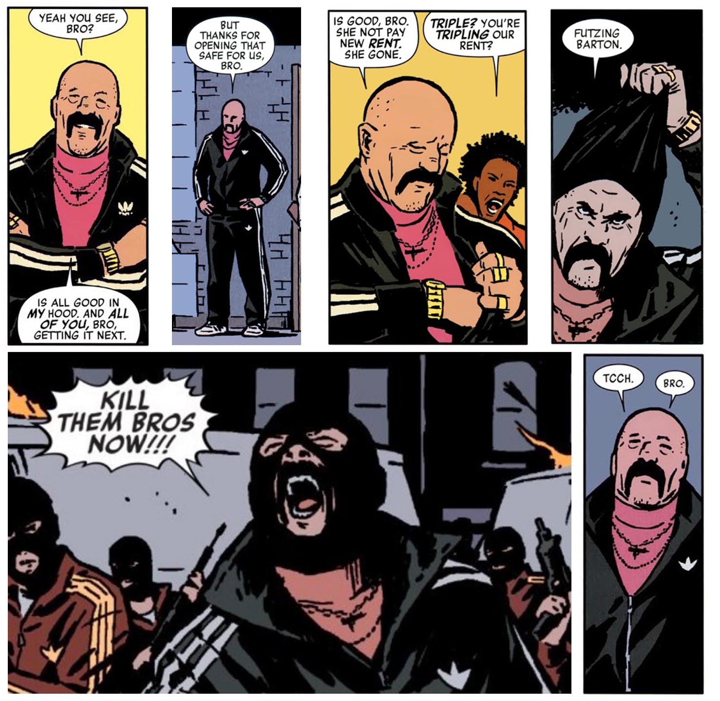 Seriously bro. Seriously: this futzing cosplay is of Ivan Banionis, the street-leader of the Tracksuit Mafia, aka the Tracksuit Draculas from the 2012 Hawkeye volume.