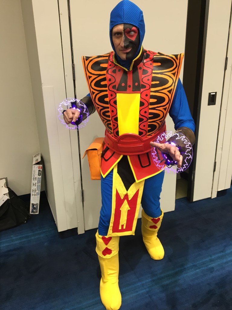I love the over-the-top costume. One thing I wanted to challenge myself with here was the edge-lit energy blasts that light up around his wrists. You’ll notice in the reference art that his energy signature, unlike most characters, lights up in a disk, not a sphere, around his hand, so it was perfect for using an edge-lit circle of plexi to mimic it. I was honestly amazed how well that part came out in the pictures.