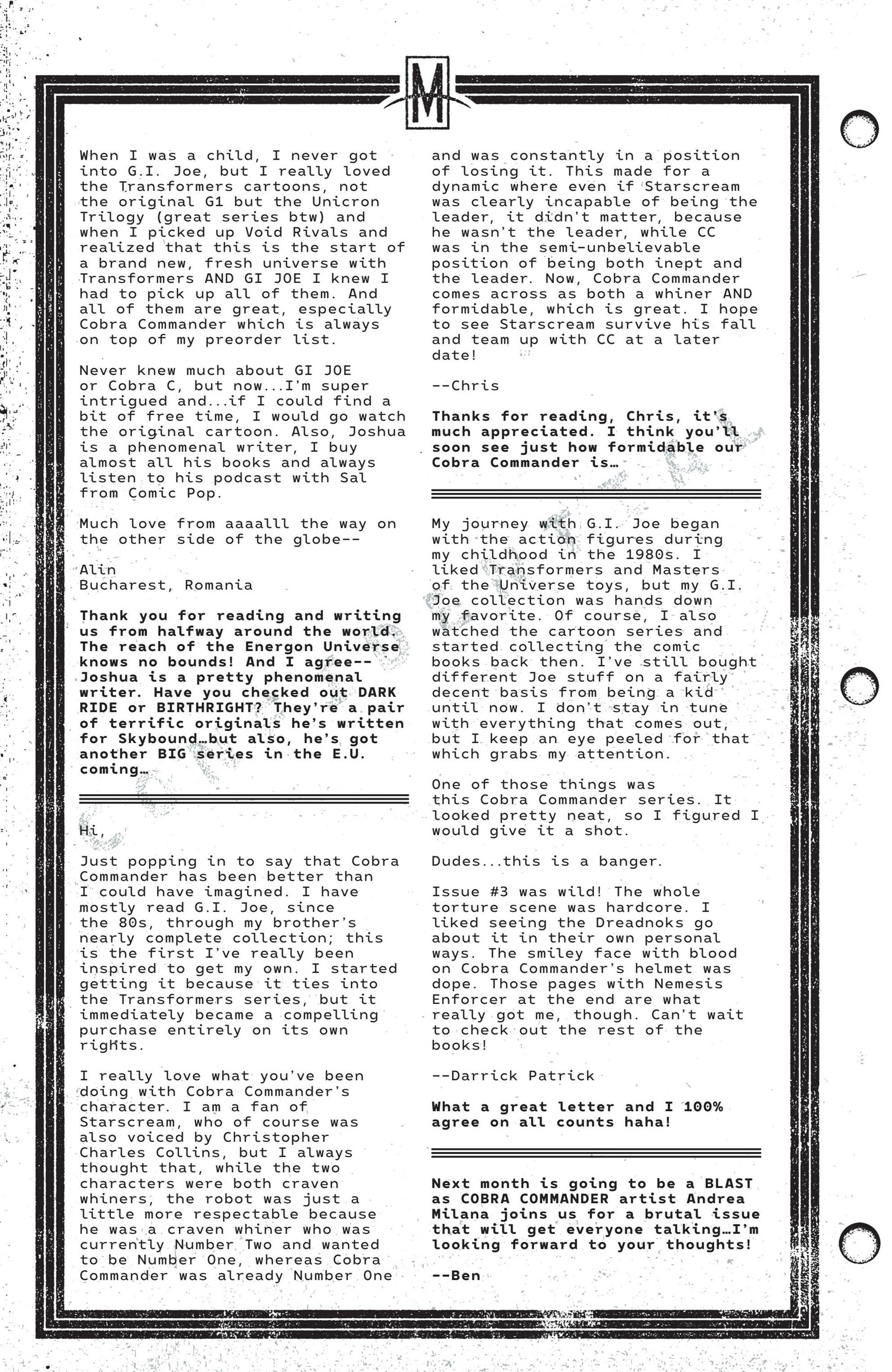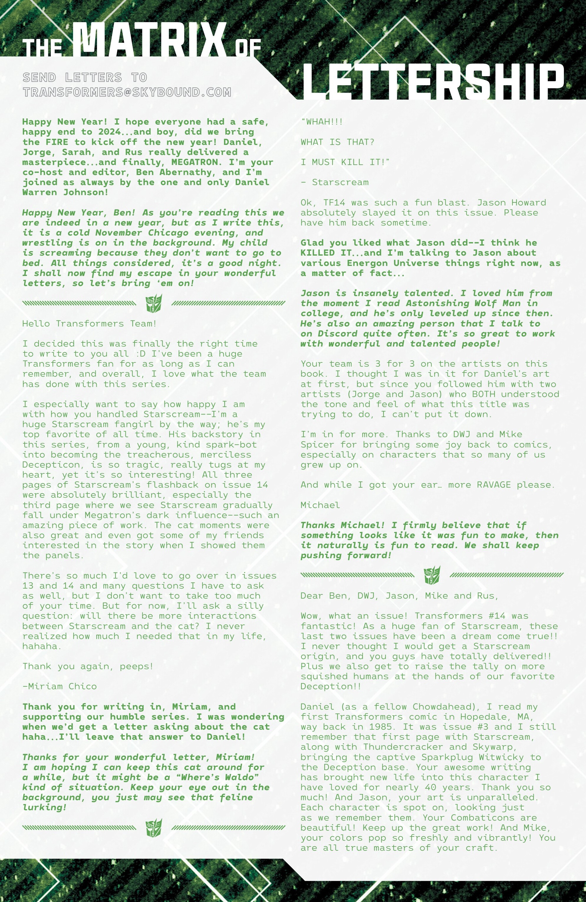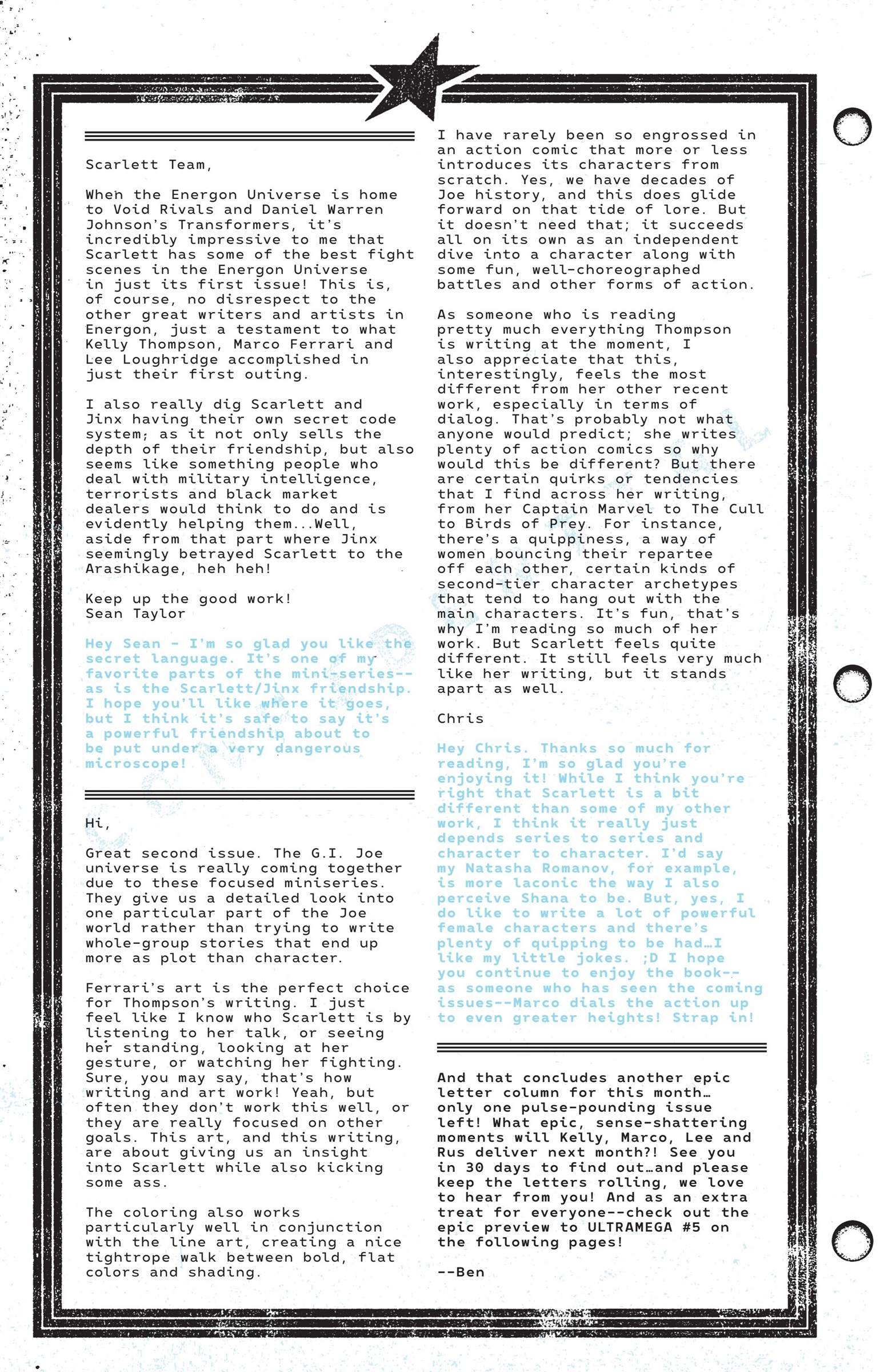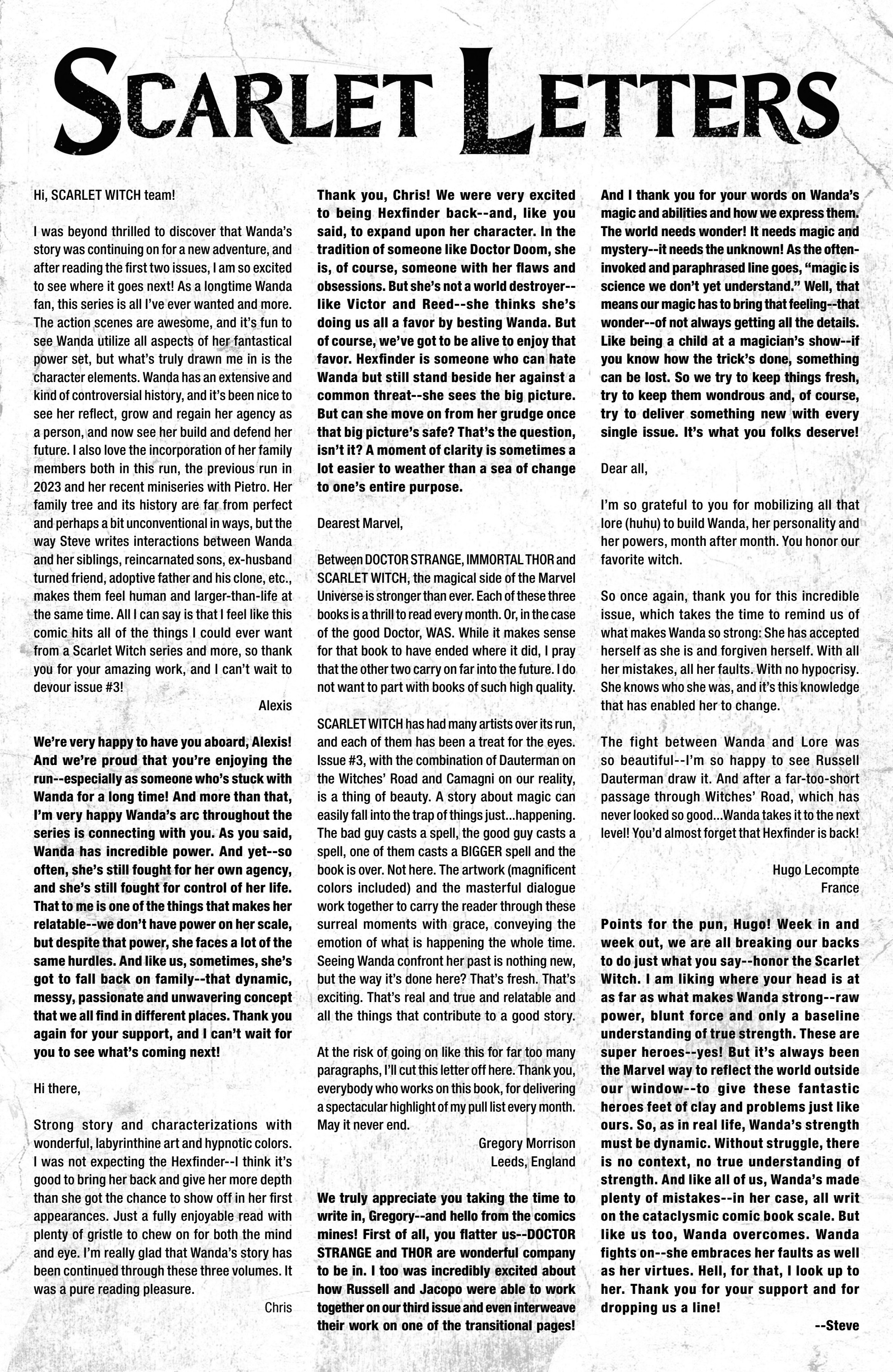 I’ve had fifty-one letters published so far: in Black Panther vol. 9, #s 3 and 6; Daredevil: Woman Without Fear vol. 2, #s 3 and 4; Destro #2; Exceptional X-Men #s 10, 12 (two letters in this issue!), and 13; Fantastic Four vol. 6, #s 12, 25, 30, 41, 44, and 48; Fantastic Four vol. 7, #s 2, 3, 4, 7, 10, 16, and 18; Grendel: Devil’s Crucible: Defiance #1; Grendel: Devil’s Odyssey #s 3 and 7; Hellcat vol. 2, #4; Magik #4, 6, and 10; Moon Knight: Fist of Khonshu vol. 2, #2, 4, and 10; Scarlett #4; Scarlet Witch vol. 4, #s 5 and 6; Spider-Woman vol. 6, # 5; That Texas Blood #20; The Power Fantasy #10 and 13; The Thing vol. 4, #5; Transformers vol. 6, #4, 16, 18, and 26; Uncanny X-Men vol. 6, #s 2, 10, and 20; X-Factor, vol. 5, #3; and X-Men vol. 8, #s 13, 16, and 21. Some issues’ lettercols are more than one page, and are shown as a whole below. Please note that because I had two letters published in Exceptional X-Men 12, that means I have 51 letters in 50 issues (for those of you counting along at home!).