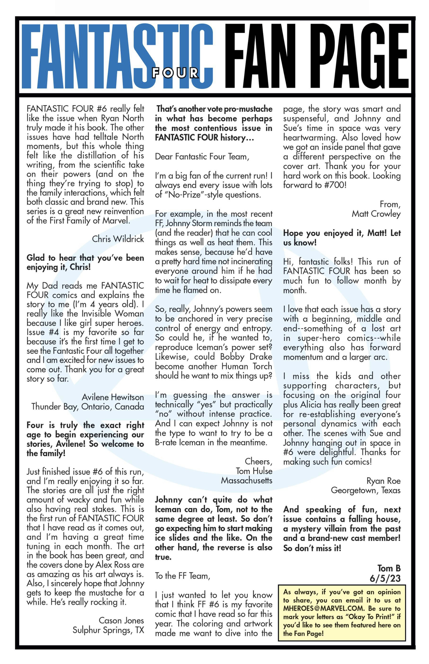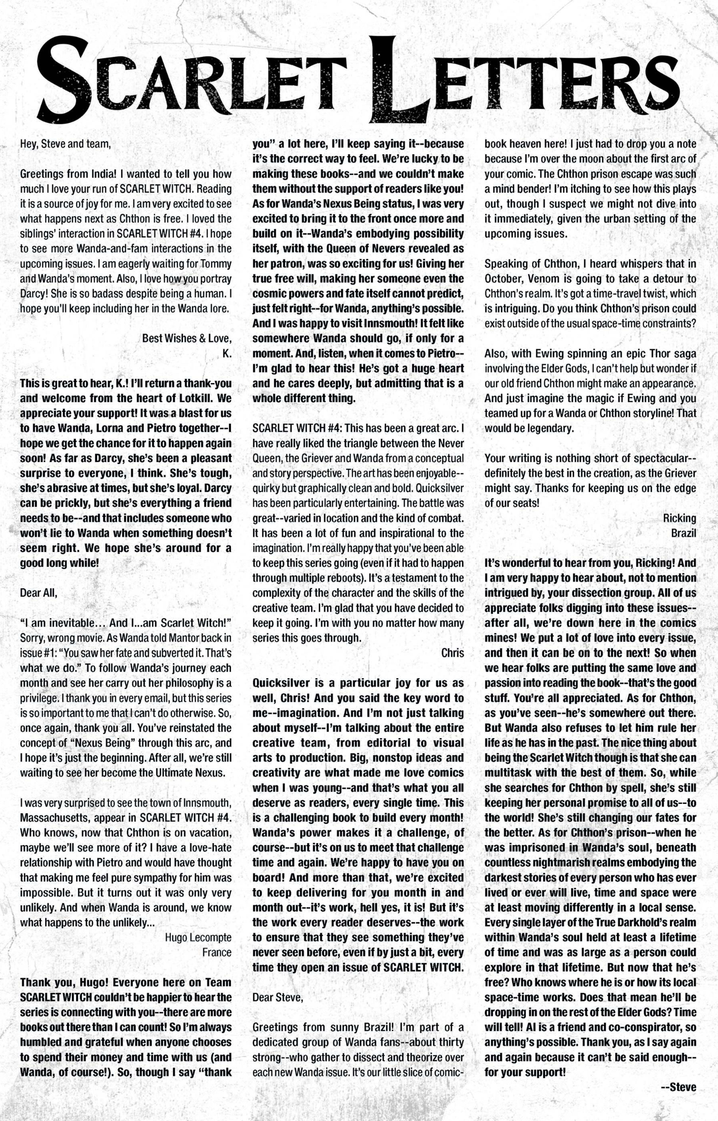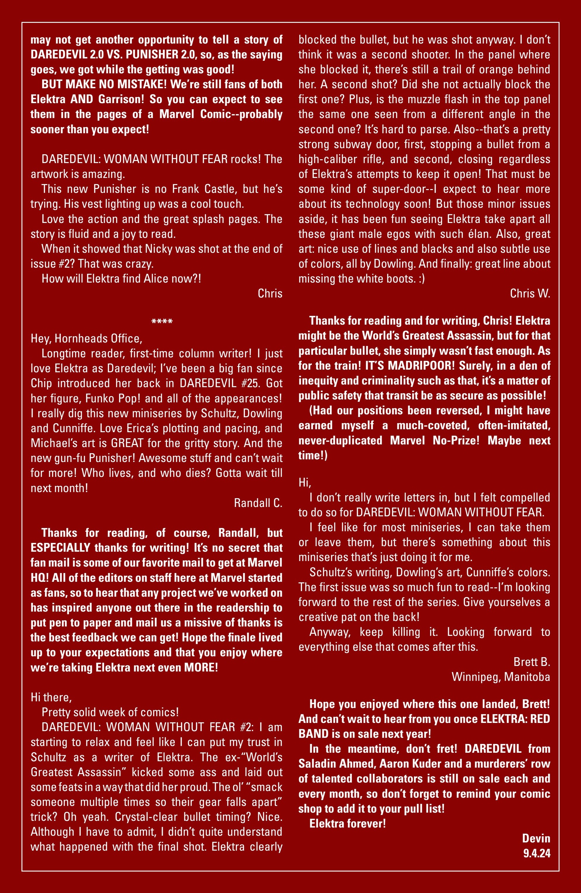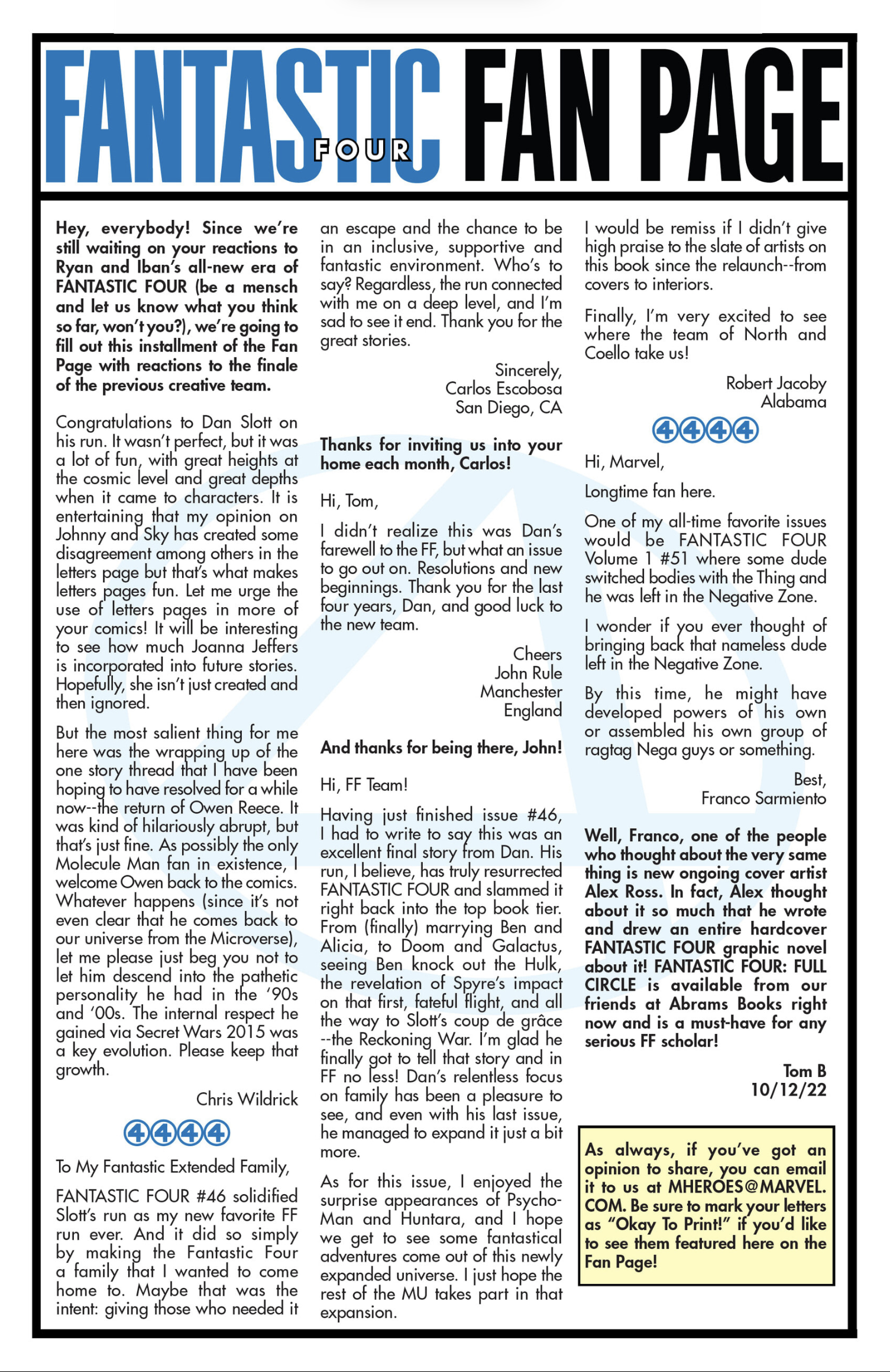 I’ve had fifty-one letters published so far: in Black Panther vol. 9, #s 3 and 6; Daredevil: Woman Without Fear vol. 2, #s 3 and 4; Destro #2; Exceptional X-Men #s 10, 12 (two letters in this issue!), and 13; Fantastic Four vol. 6, #s 12, 25, 30, 41, 44, and 48; Fantastic Four vol. 7, #s 2, 3, 4, 7, 10, 16, and 18; Grendel: Devil’s Crucible: Defiance #1; Grendel: Devil’s Odyssey #s 3 and 7; Hellcat vol. 2, #4; Magik #4, 6, and 10; Moon Knight: Fist of Khonshu vol. 2, #2, 4, and 10; Scarlett #4; Scarlet Witch vol. 4, #s 5 and 6; Spider-Woman vol. 6, # 5; That Texas Blood #20; The Power Fantasy #10 and 13; The Thing vol. 4, #5; Transformers vol. 6, #4, 16, 18, and 26; Uncanny X-Men vol. 6, #s 2, 10, and 20; X-Factor, vol. 5, #3; and X-Men vol. 8, #s 13, 16, and 21. Some issues’ lettercols are more than one page, and are shown as a whole below. Please note that because I had two letters published in Exceptional X-Men 12, that means I have 51 letters in 50 issues (for those of you counting along at home!).