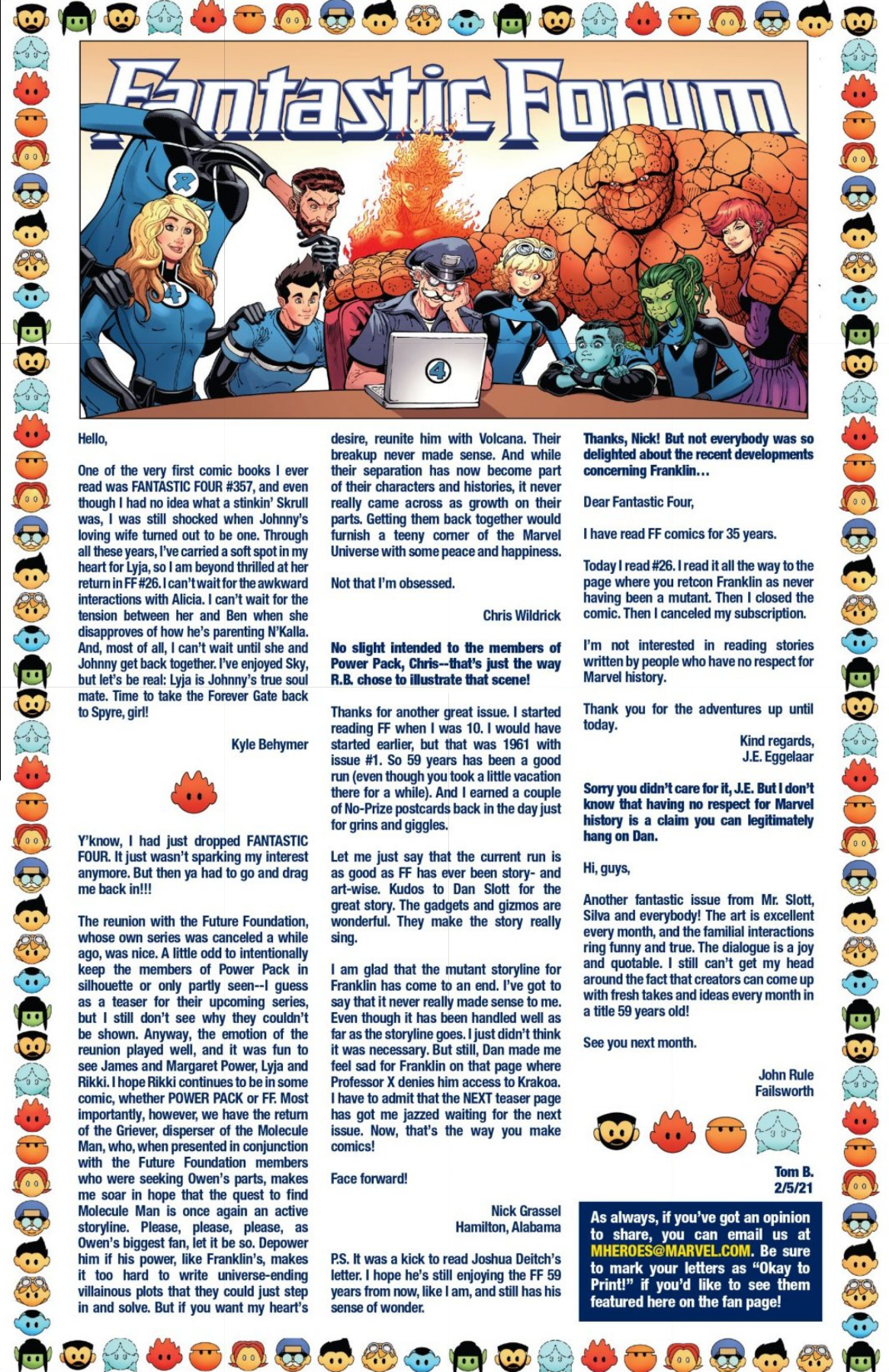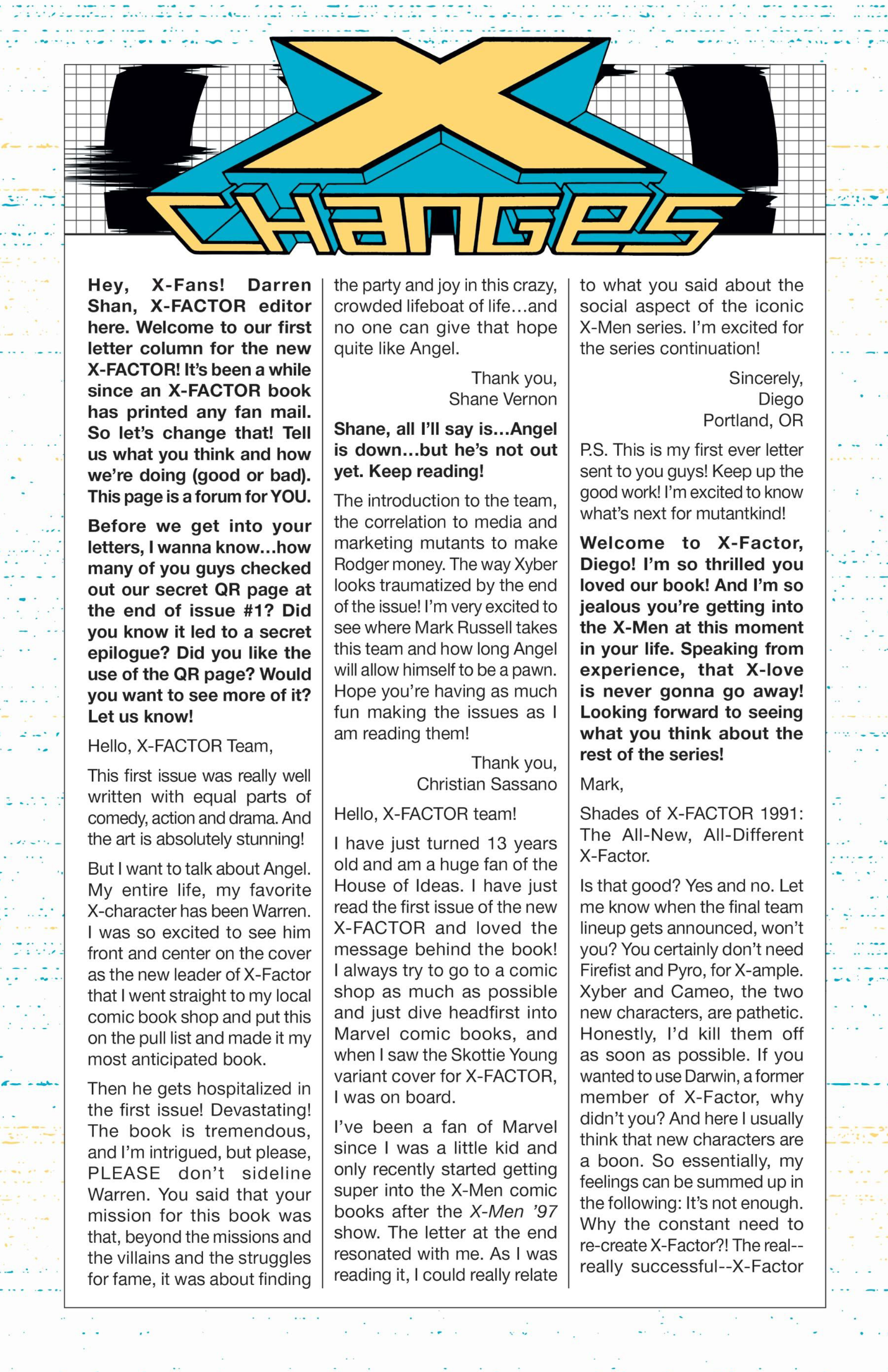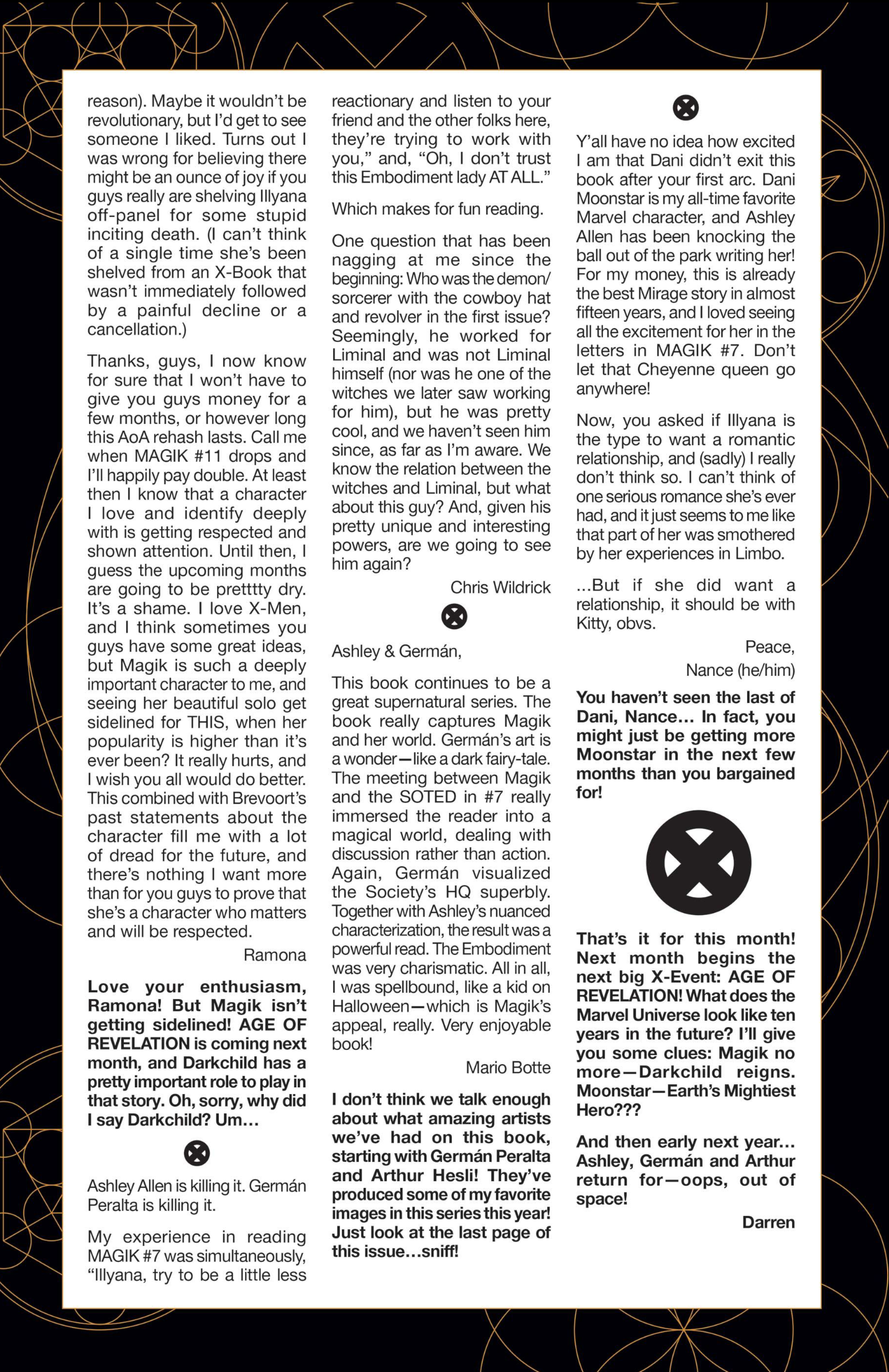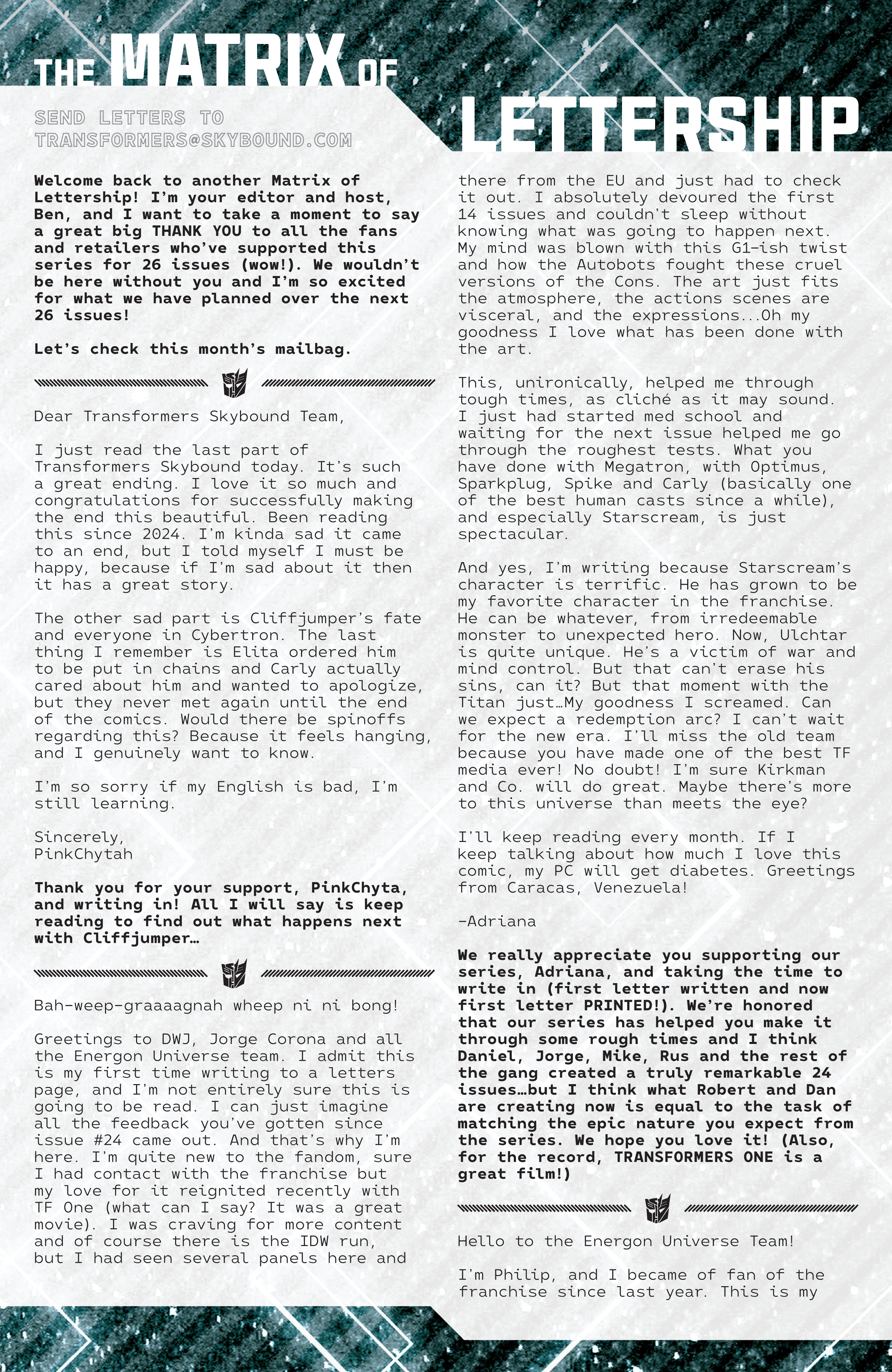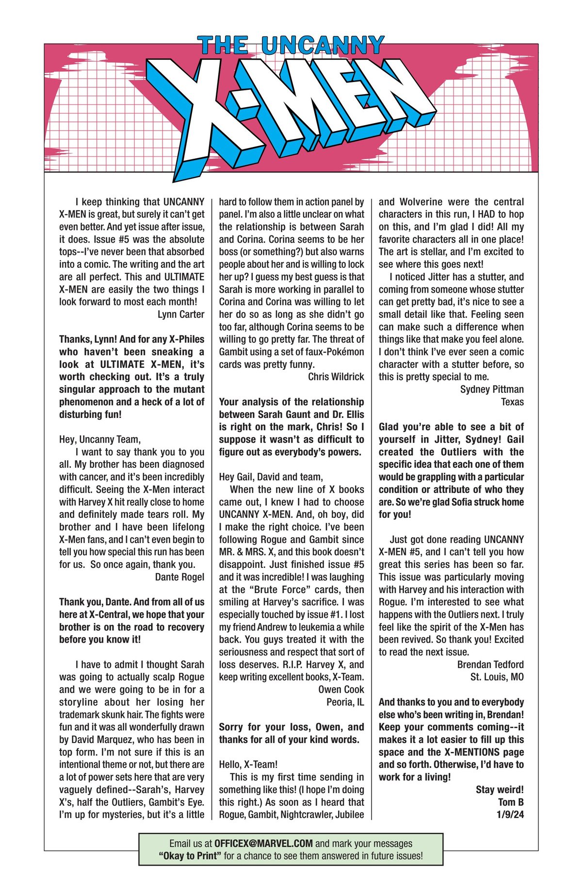 I’ve had fifty-one letters published so far: in Black Panther vol. 9, #s 3 and 6; Daredevil: Woman Without Fear vol. 2, #s 3 and 4; Destro #2; Exceptional X-Men #s 10, 12 (two letters in this issue!), and 13; Fantastic Four vol. 6, #s 12, 25, 30, 41, 44, and 48; Fantastic Four vol. 7, #s 2, 3, 4, 7, 10, 16, and 18; Grendel: Devil’s Crucible: Defiance #1; Grendel: Devil’s Odyssey #s 3 and 7; Hellcat vol. 2, #4; Magik #4, 6, and 10; Moon Knight: Fist of Khonshu vol. 2, #2, 4, and 10; Scarlett #4; Scarlet Witch vol. 4, #s 5 and 6; Spider-Woman vol. 6, # 5; That Texas Blood #20; The Power Fantasy #10 and 13; The Thing vol. 4, #5; Transformers vol. 6, #4, 16, 18, and 26; Uncanny X-Men vol. 6, #s 2, 10, and 20; X-Factor, vol. 5, #3; and X-Men vol. 8, #s 13, 16, and 21. Some issues’ lettercols are more than one page, and are shown as a whole below. Please note that because I had two letters published in Exceptional X-Men 12, that means I have 51 letters in 50 issues (for those of you counting along at home!).