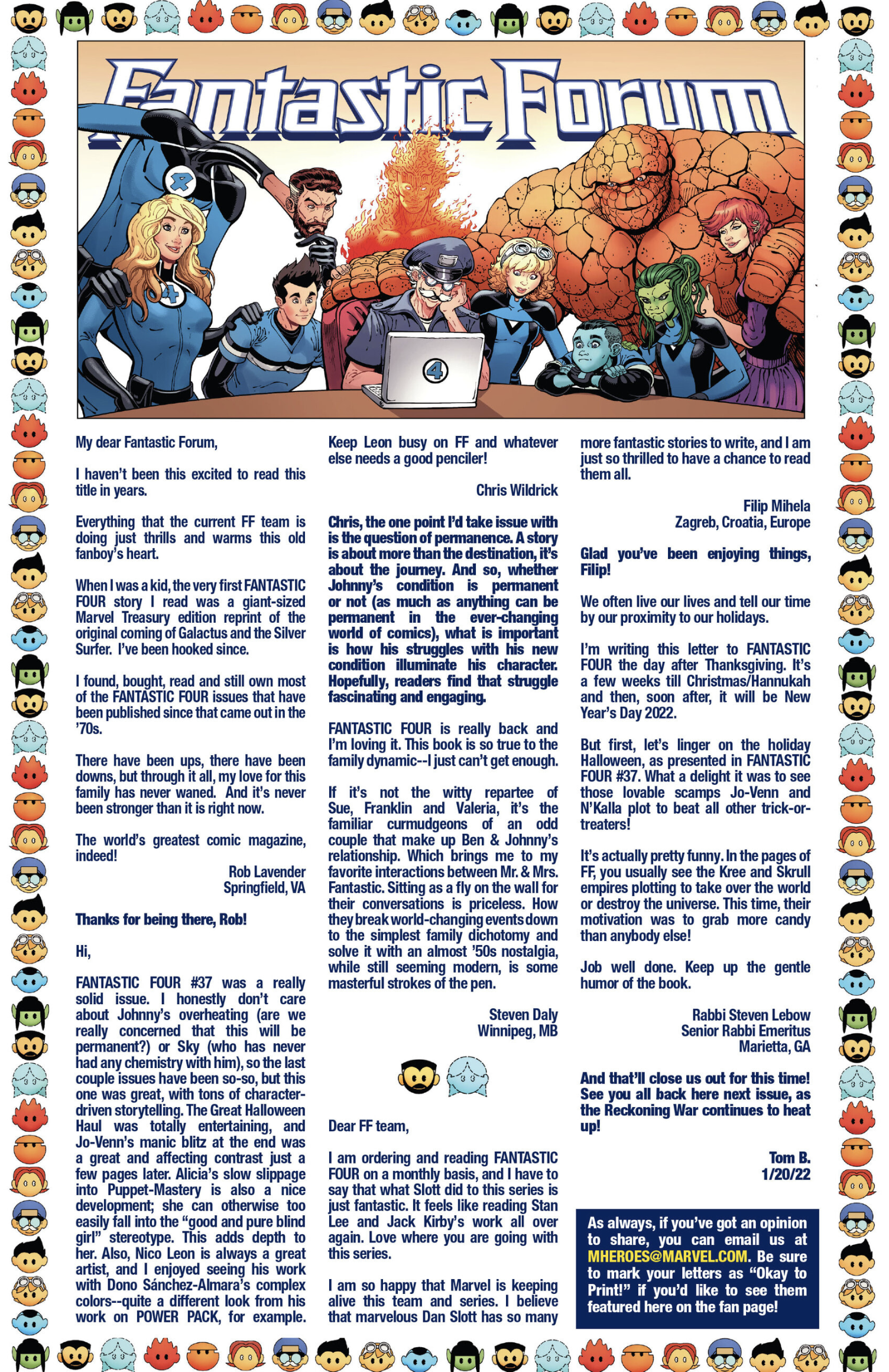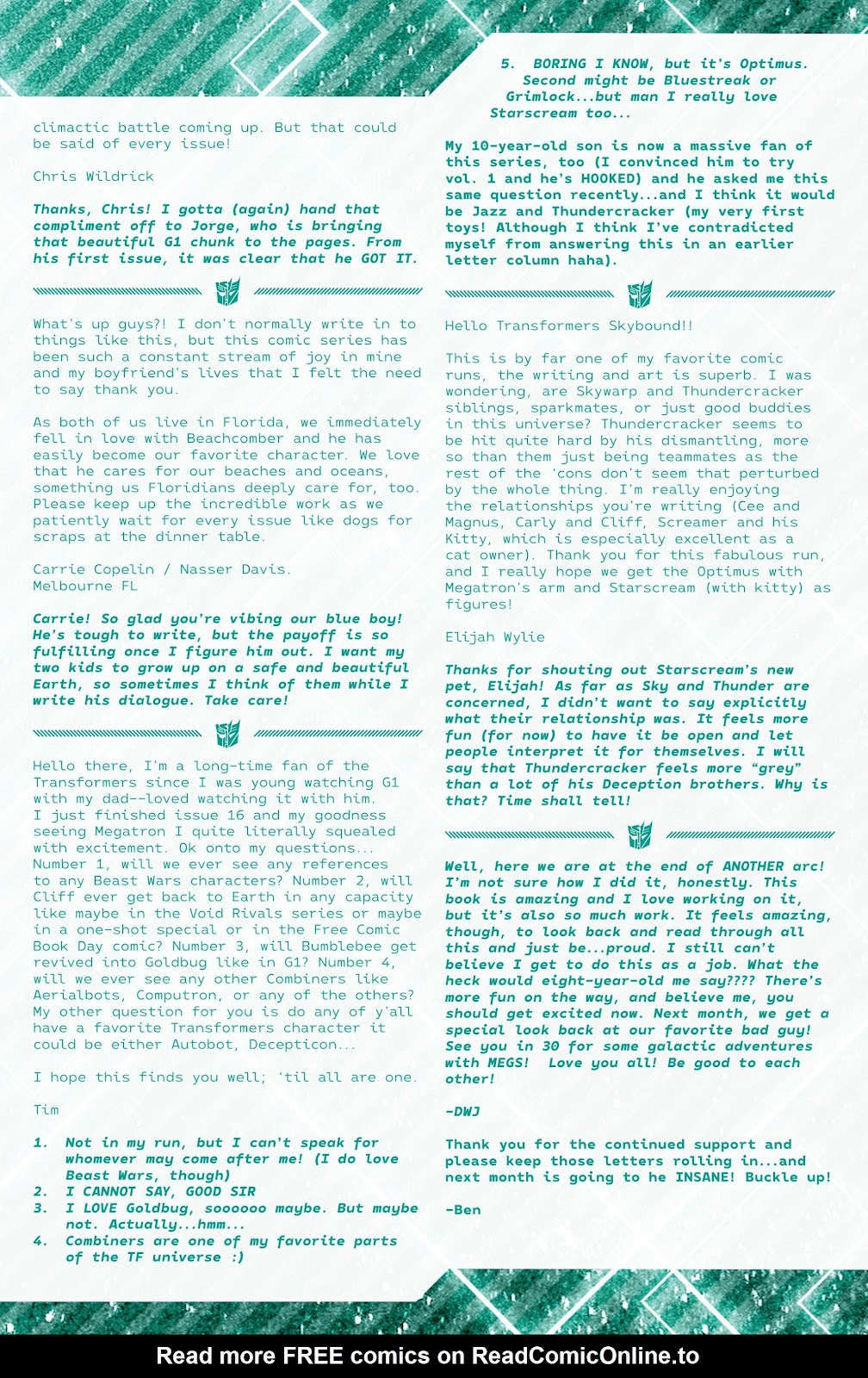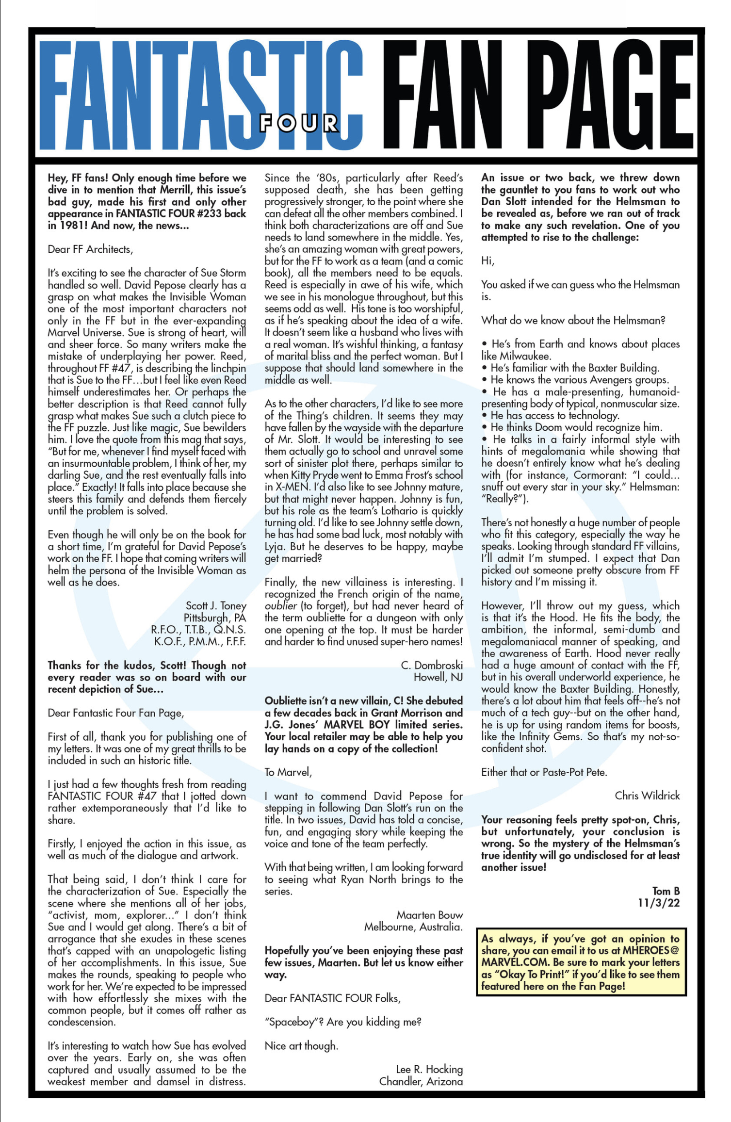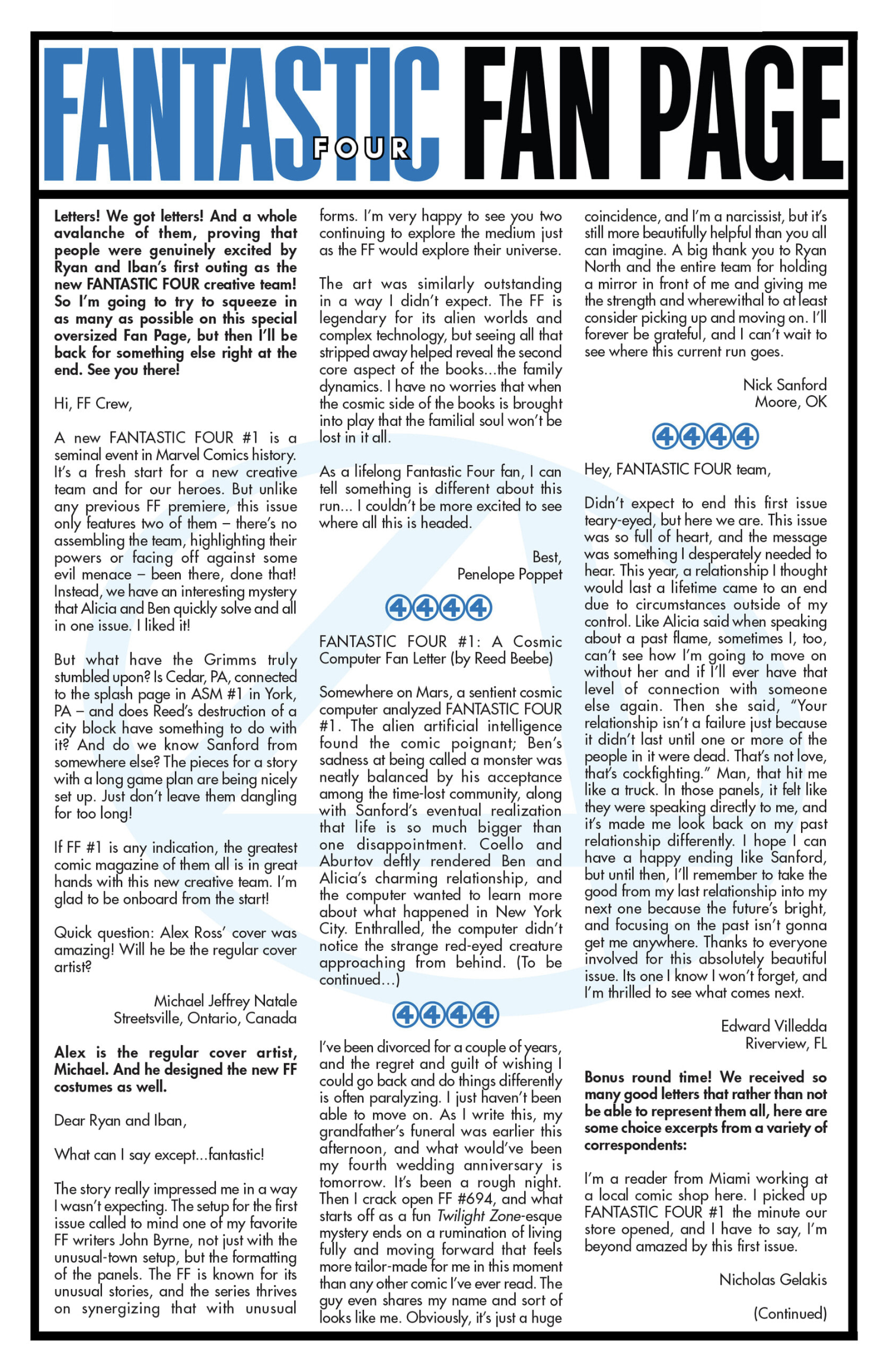 I’ve had fifty-one letters published so far: in Black Panther vol. 9, #s 3 and 6; Daredevil: Woman Without Fear vol. 2, #s 3 and 4; Destro #2; Exceptional X-Men #s 10, 12 (two letters in this issue!), and 13; Fantastic Four vol. 6, #s 12, 25, 30, 41, 44, and 48; Fantastic Four vol. 7, #s 2, 3, 4, 7, 10, 16, and 18; Grendel: Devil’s Crucible: Defiance #1; Grendel: Devil’s Odyssey #s 3 and 7; Hellcat vol. 2, #4; Magik #4, 6, and 10; Moon Knight: Fist of Khonshu vol. 2, #2, 4, and 10; Scarlett #4; Scarlet Witch vol. 4, #s 5 and 6; Spider-Woman vol. 6, # 5; That Texas Blood #20; The Power Fantasy #10 and 13; The Thing vol. 4, #5; Transformers vol. 6, #4, 16, 18, and 26; Uncanny X-Men vol. 6, #s 2, 10, and 20; X-Factor, vol. 5, #3; and X-Men vol. 8, #s 13, 16, and 21. Some issues’ lettercols are more than one page, and are shown as a whole below. Please note that because I had two letters published in Exceptional X-Men 12, that means I have 51 letters in 50 issues (for those of you counting along at home!).