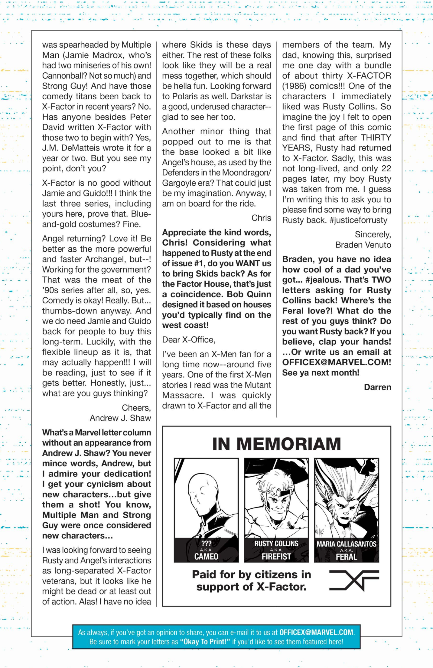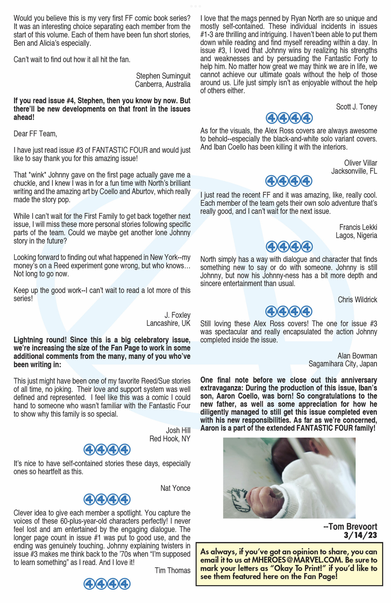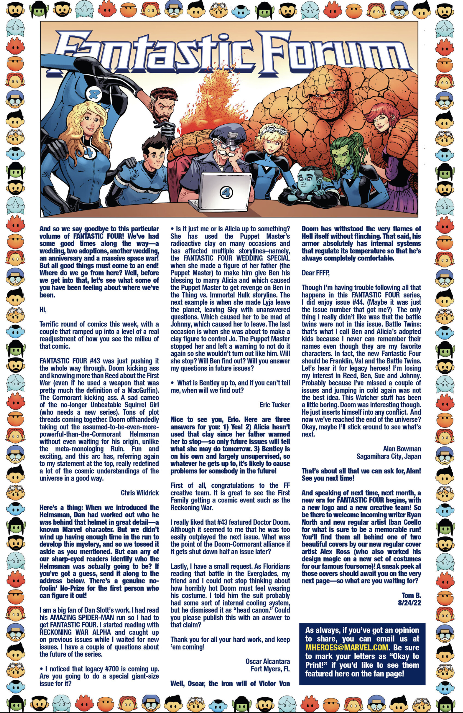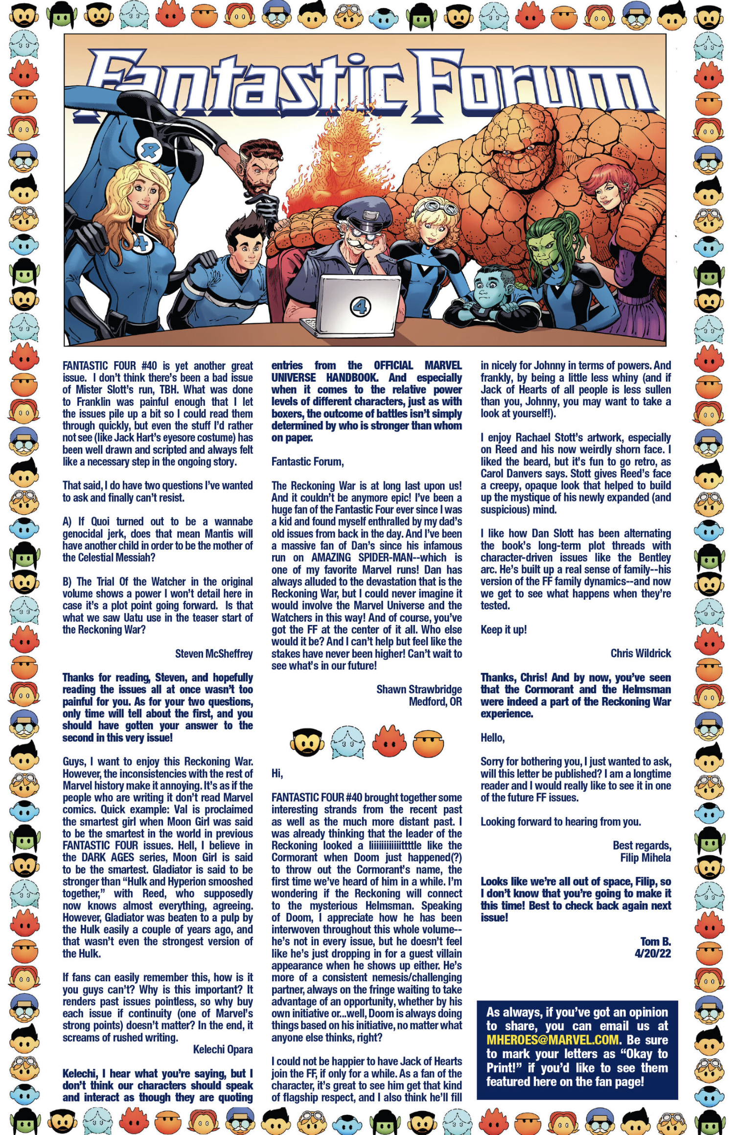 I’ve had fifty-one letters published so far: in Black Panther vol. 9, #s 3 and 6; Daredevil: Woman Without Fear vol. 2, #s 3 and 4; Destro #2; Exceptional X-Men #s 10, 12 (two letters in this issue!), and 13; Fantastic Four vol. 6, #s 12, 25, 30, 41, 44, and 48; Fantastic Four vol. 7, #s 2, 3, 4, 7, 10, 16, and 18; Grendel: Devil’s Crucible: Defiance #1; Grendel: Devil’s Odyssey #s 3 and 7; Hellcat vol. 2, #4; Magik #4, 6, and 10; Moon Knight: Fist of Khonshu vol. 2, #2, 4, and 10; Scarlett #4; Scarlet Witch vol. 4, #s 5 and 6; Spider-Woman vol. 6, # 5; That Texas Blood #20; The Power Fantasy #10 and 13; The Thing vol. 4, #5; Transformers vol. 6, #4, 16, 18, and 26; Uncanny X-Men vol. 6, #s 2, 10, and 20; X-Factor, vol. 5, #3; and X-Men vol. 8, #s 13, 16, and 21. Some issues’ lettercols are more than one page, and are shown as a whole below. Please note that because I had two letters published in Exceptional X-Men 12, that means I have 51 letters in 50 issues (for those of you counting along at home!).