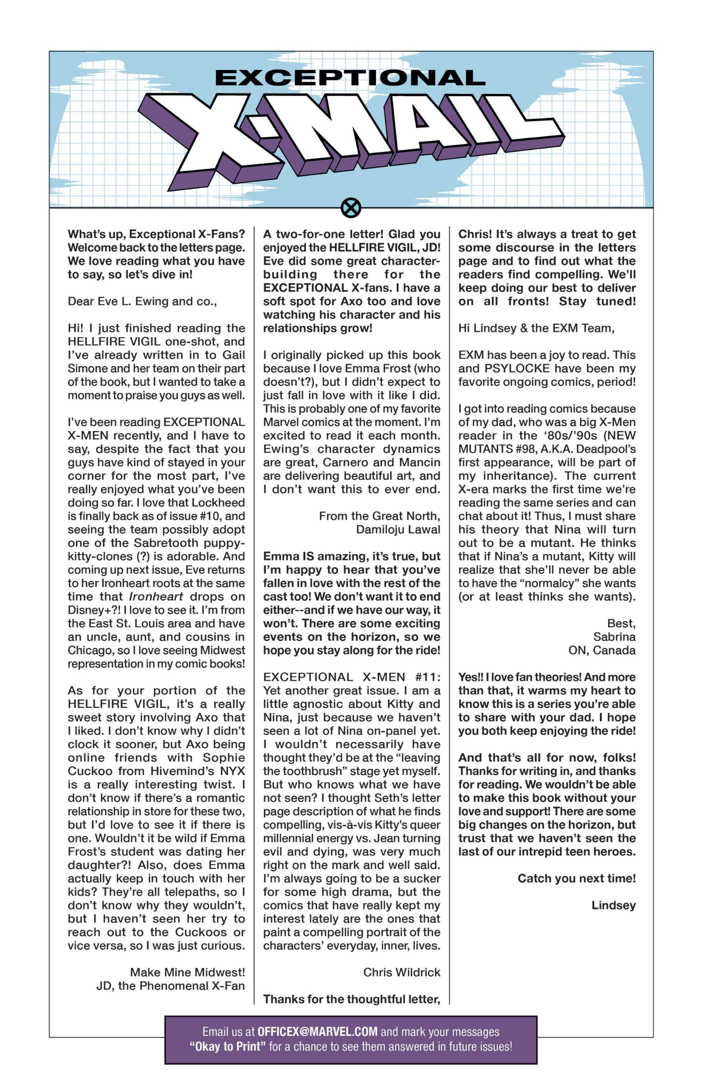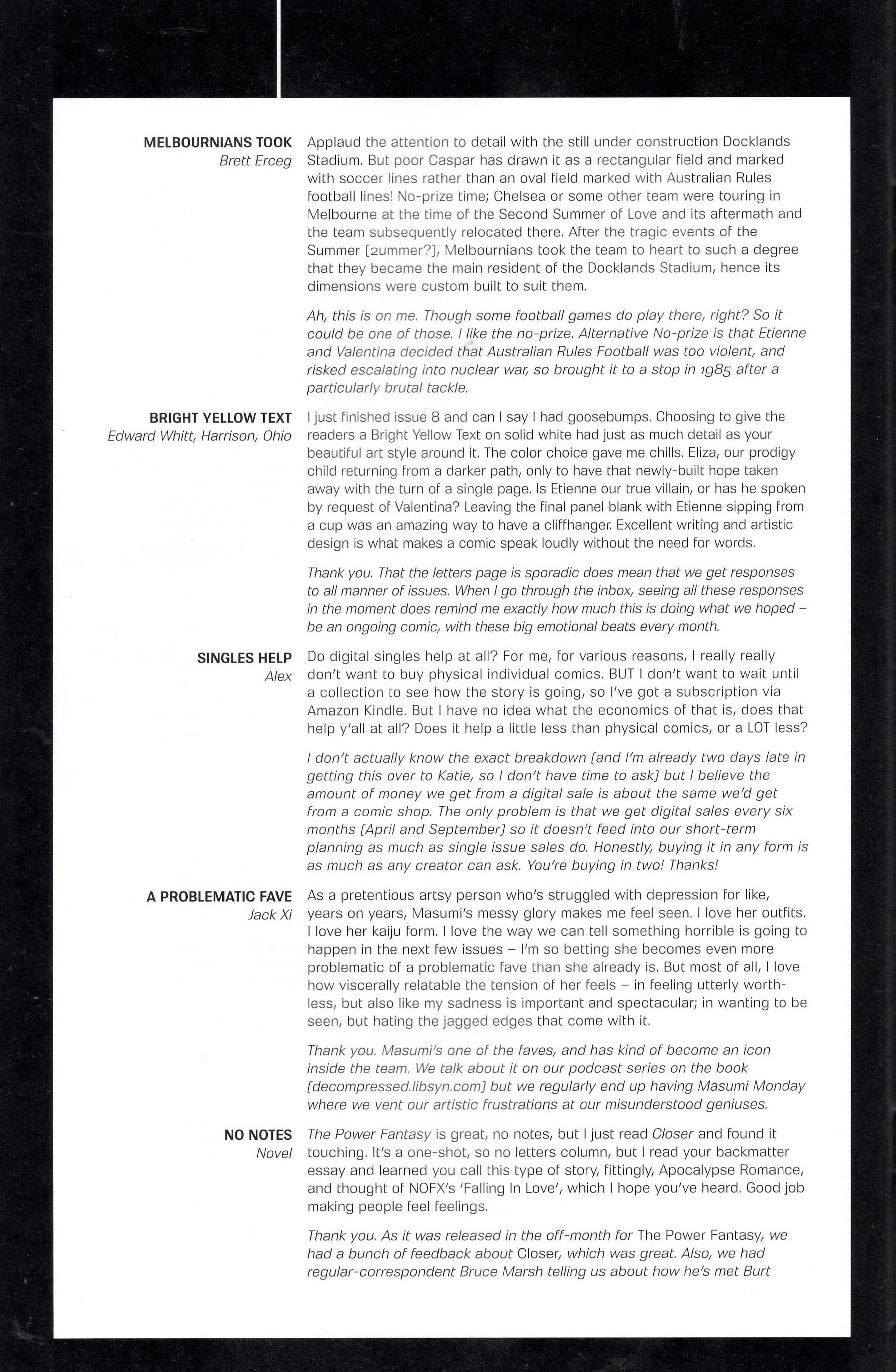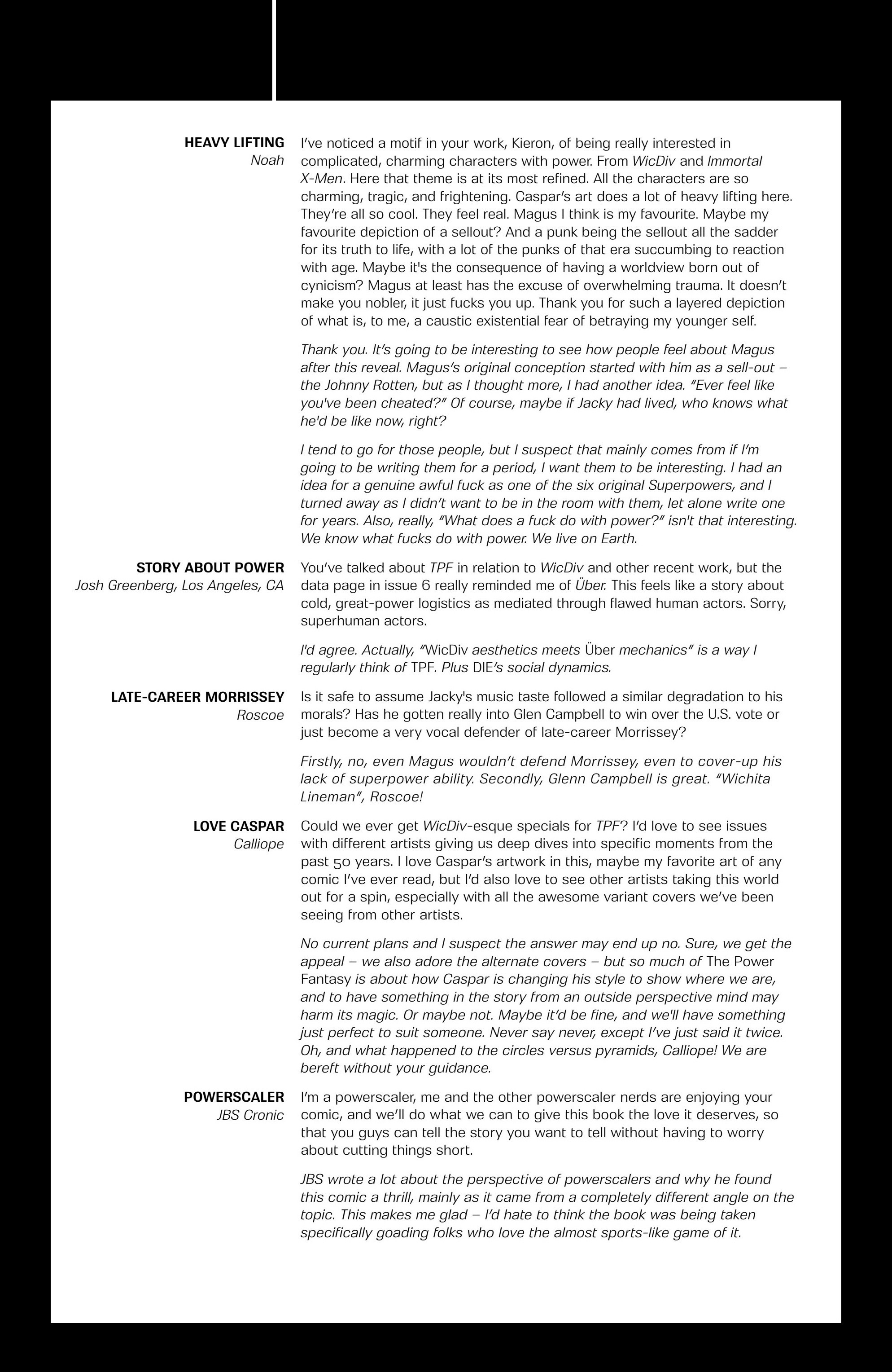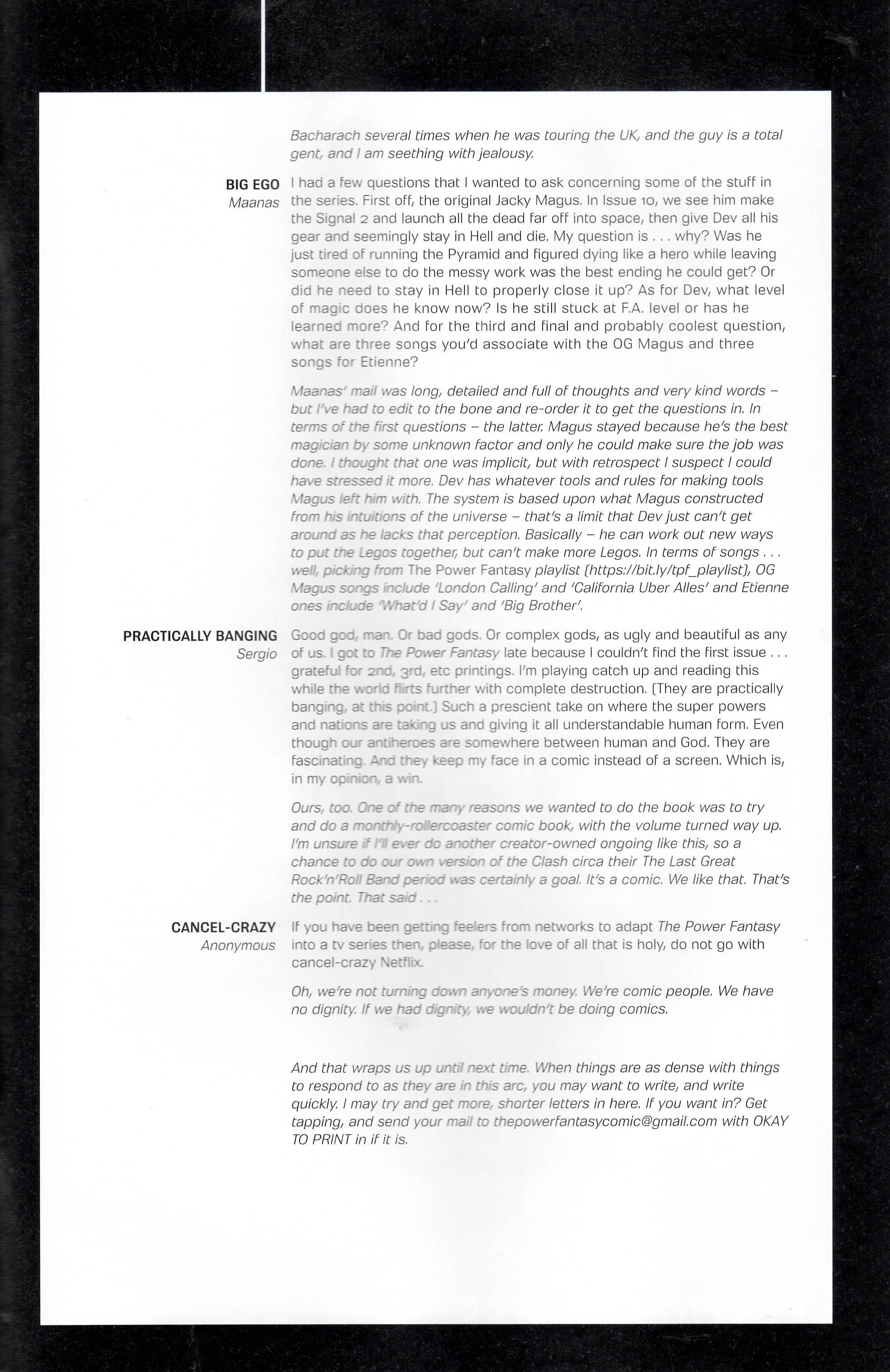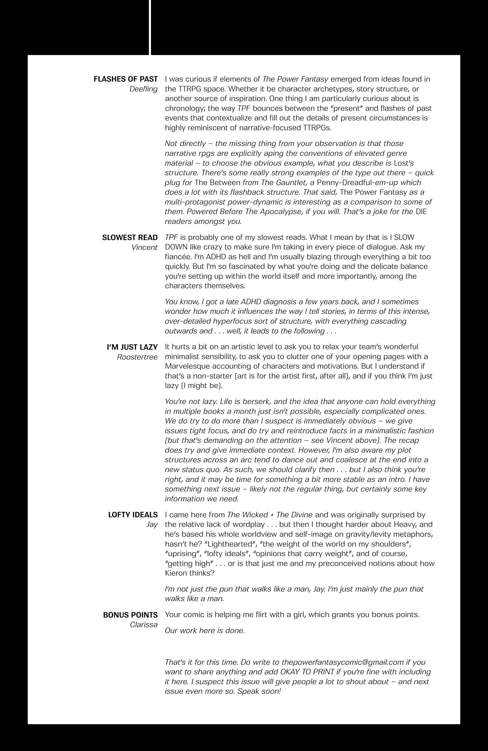 Another non-published letter was due to the timing…in the sense that I wrote it five years too late. In 2024, I wrote to The Wicked + The Divine after reading several issues I found in a dollar bin. The only challenge here is that the series ended in 2019. The WicDiv lettercol was an intrinsic part of the book, with writer Kieron Gillen making various running jokes, such as creating bespoke “ok to print” acknowledgement lines for each issue, and always replying to a prolific letterhack, Cam, with the same friendly “Thanks, Cam” response. I felt like there is no reason a letter column, especially one with an email, should be anchored in time to just when the comic is actually being produced. We still have opinions and responses to comics, no matter how long ago they were published, so I decided to just write in–and I got an almost instant response from Gillen saying, “This was all really touching, Chris. Thanks for doing it.” So props to Kieron Gillen for confirming that lettercols are eternal and atemporal!
