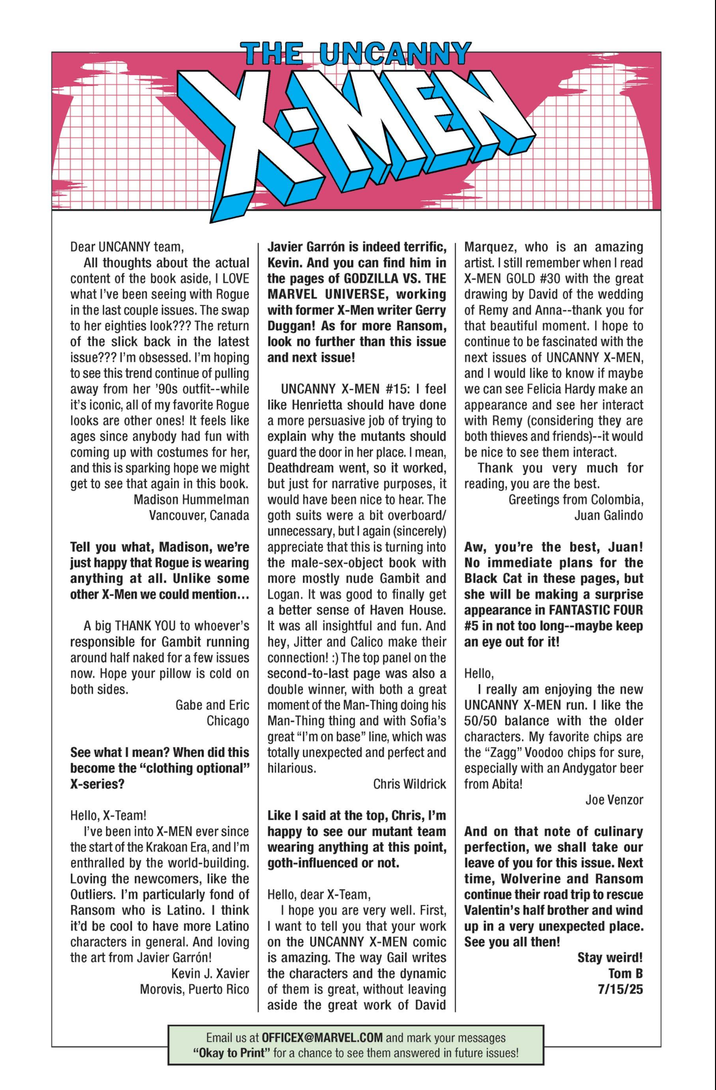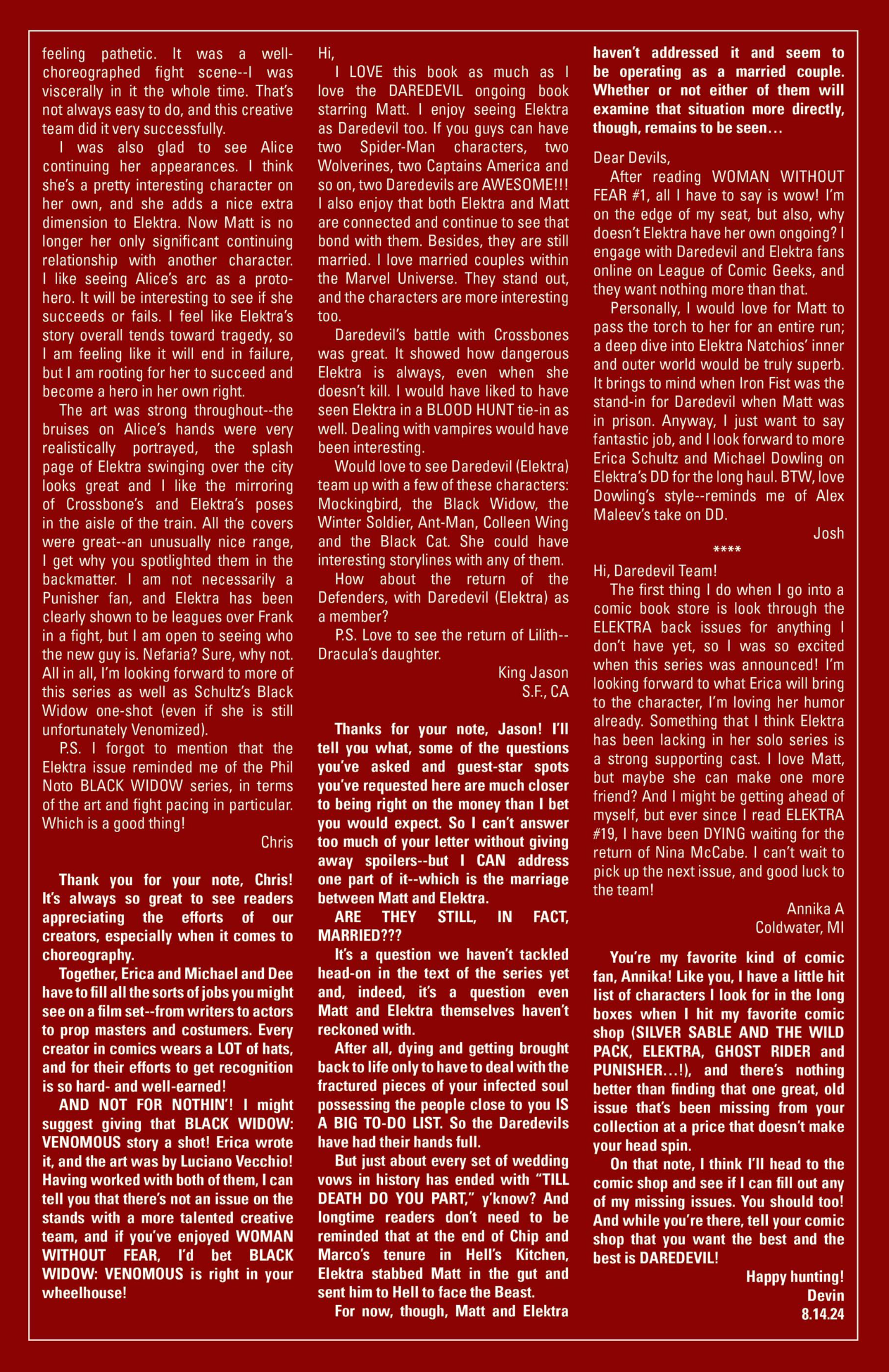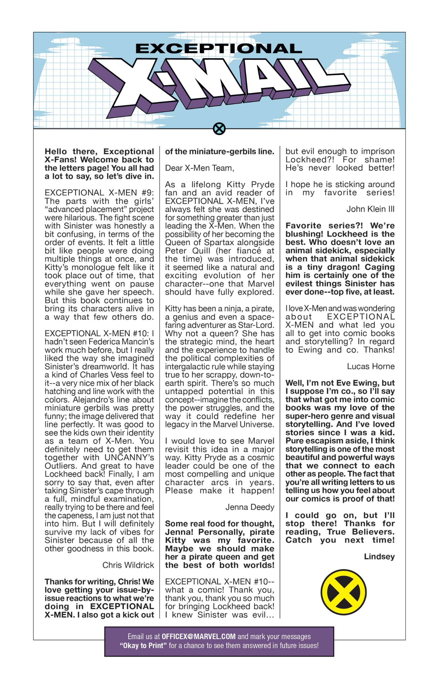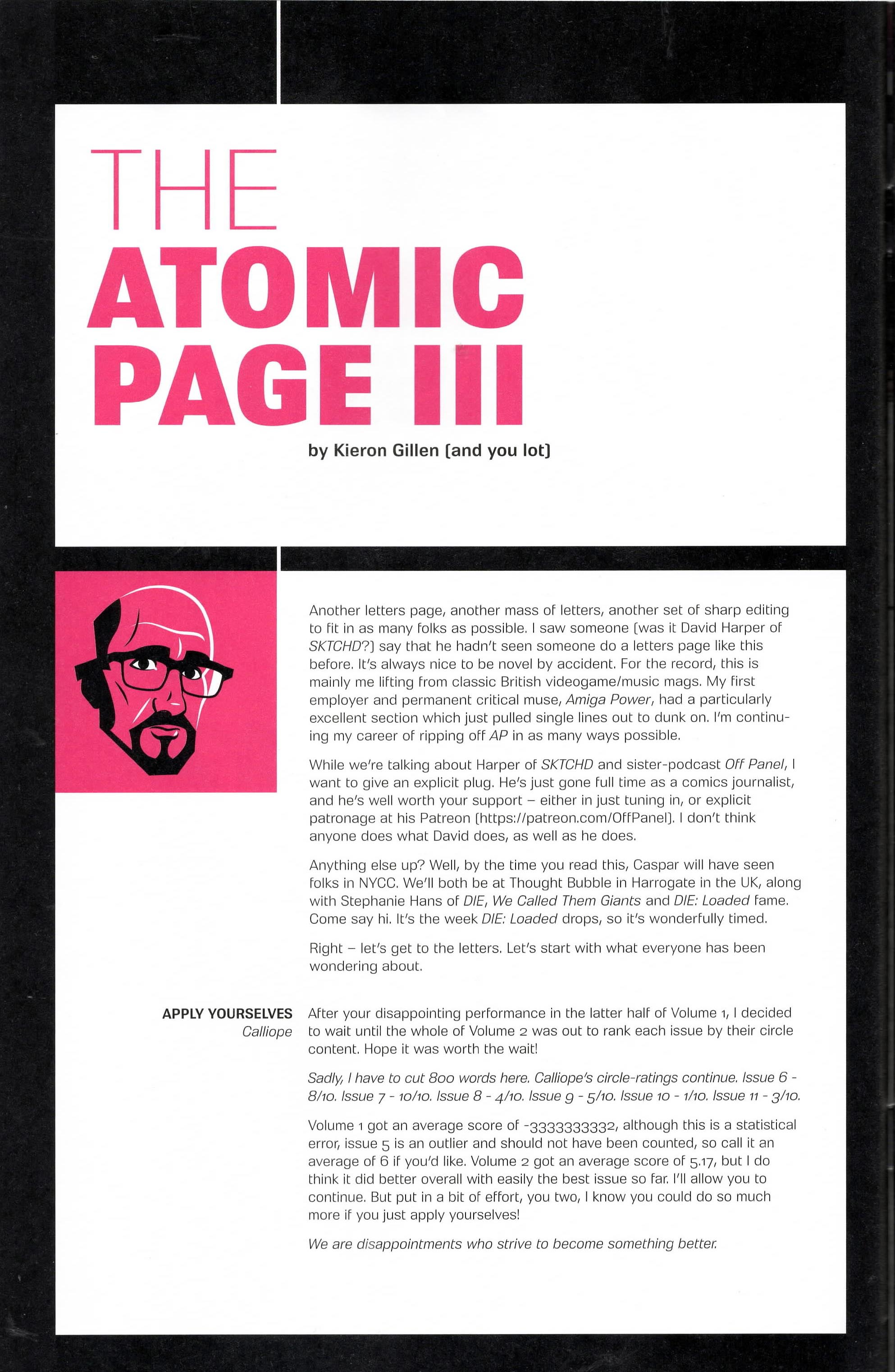 Another non-published letter was due to the timing…in the sense that I wrote it five years too late. In 2024, I wrote to The Wicked + The Divine after reading several issues I found in a dollar bin. The only challenge here is that the series ended in 2019. The WicDiv lettercol was an intrinsic part of the book, with writer Kieron Gillen making various running jokes, such as creating bespoke “ok to print” acknowledgement lines for each issue, and always replying to a prolific letterhack, Cam, with the same friendly “Thanks, Cam” response. I felt like there is no reason a letter column, especially one with an email, should be anchored in time to just when the comic is actually being produced. We still have opinions and responses to comics, no matter how long ago they were published, so I decided to just write in–and I got an almost instant response from Gillen saying, “This was all really touching, Chris. Thanks for doing it.” So props to Kieron Gillen for confirming that lettercols are eternal and atemporal!