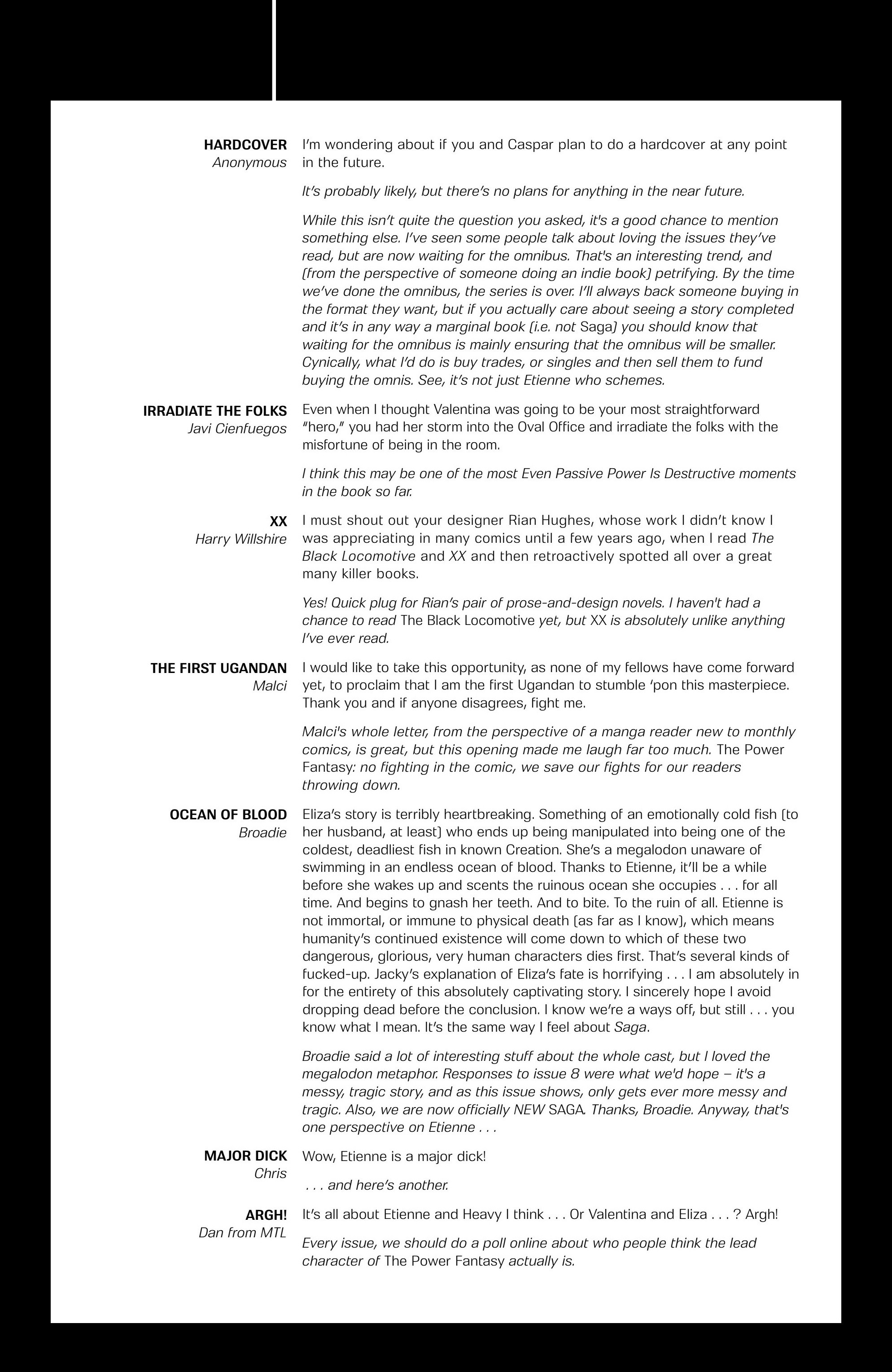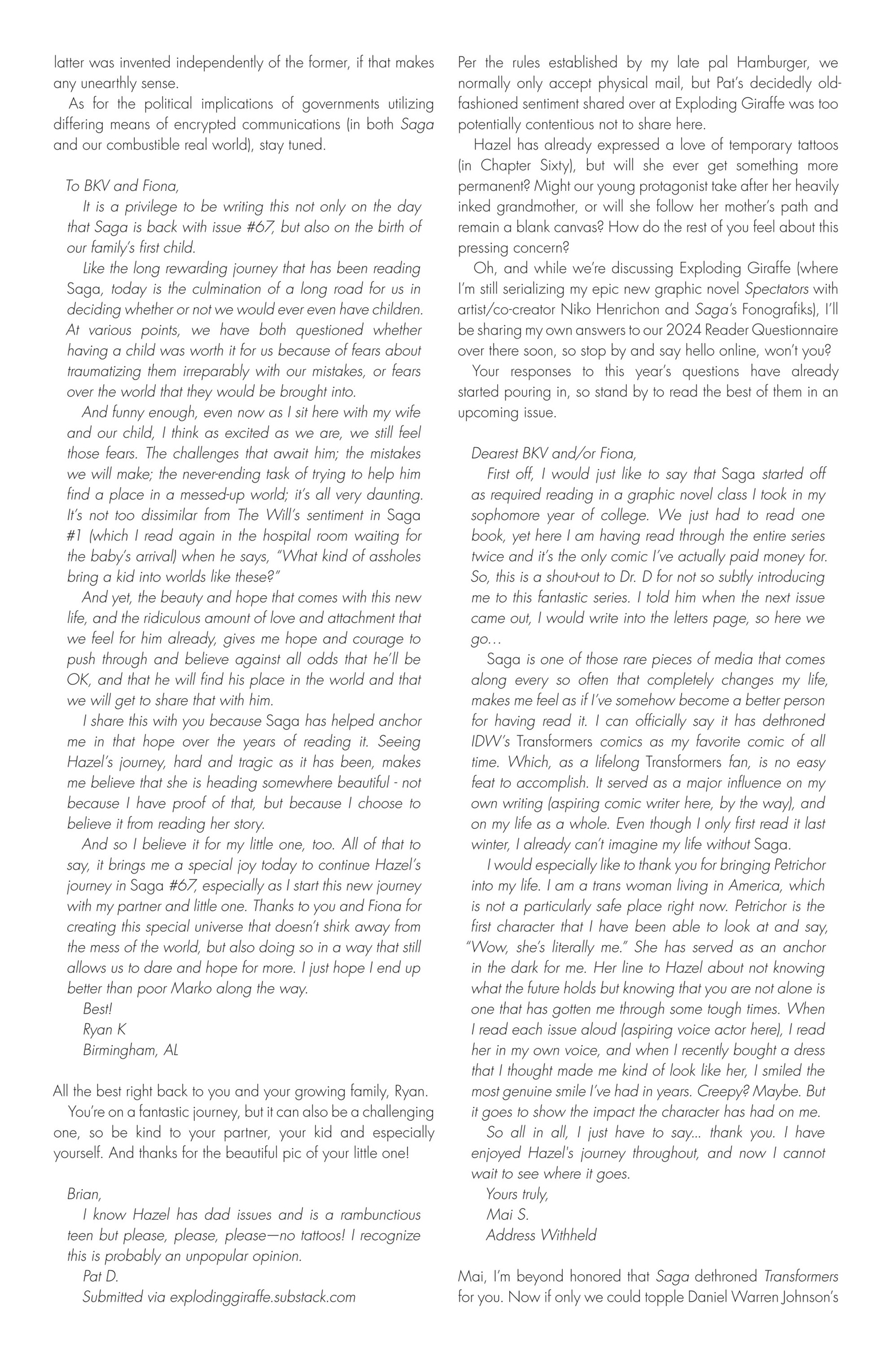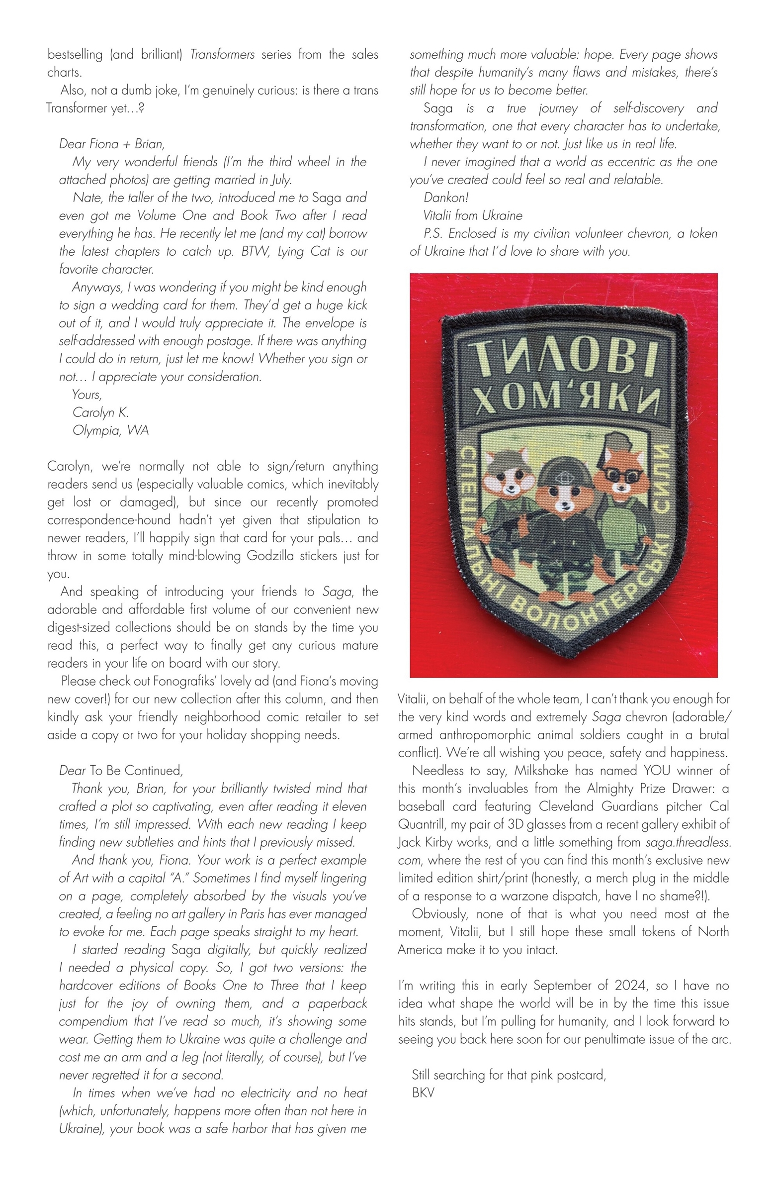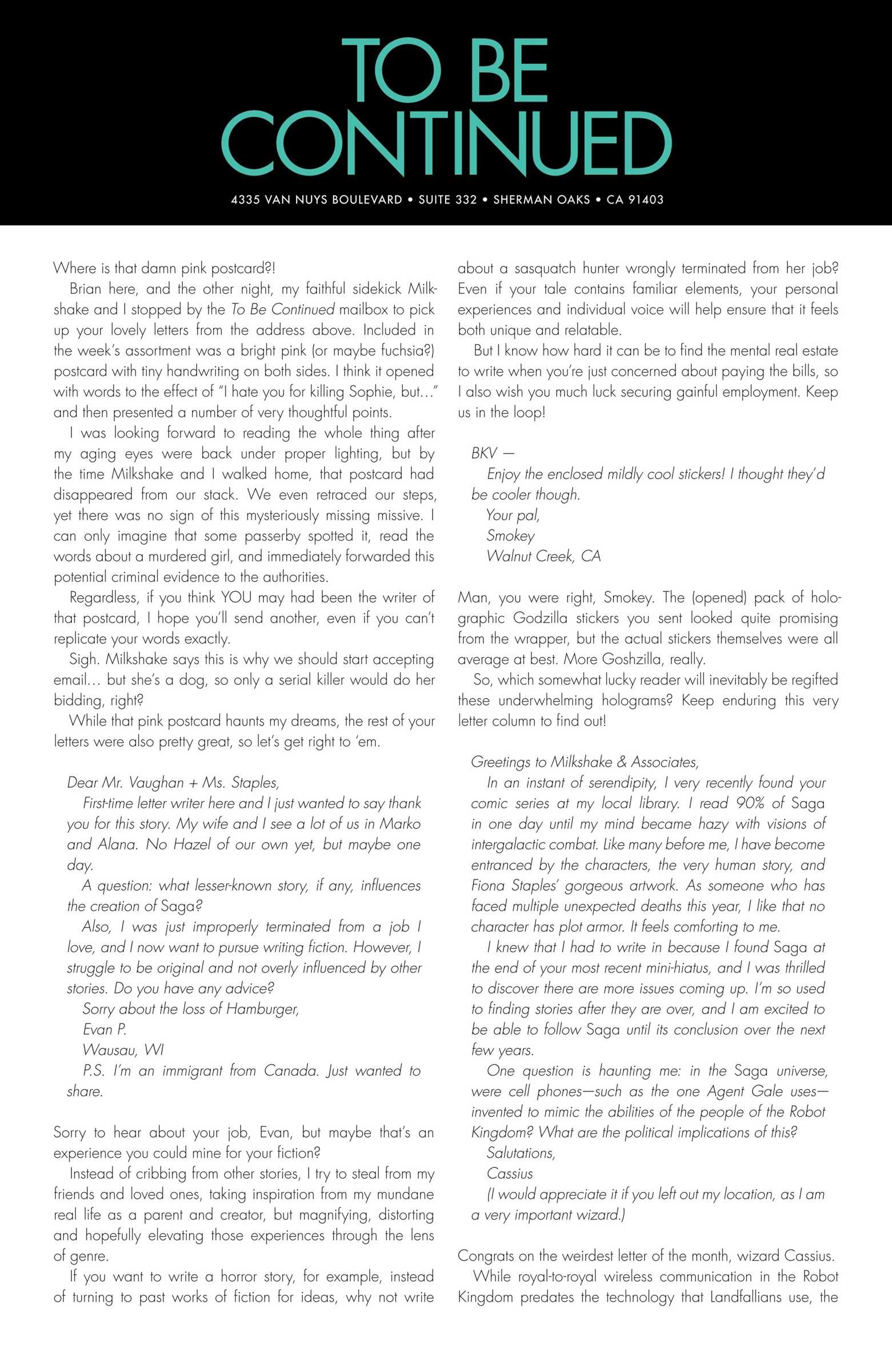 Another letter was not published, but was given an extensive treatment in the lettercol. Brian K. Vaughan wrote in Saga #70 that he had received a pink postcard with writing on both sides that he really liked, but that he had lost, and talked about his frustration at losing it at length, then wrapped up the letters page for that issue 3 pages later with another reference to it. This was my card.