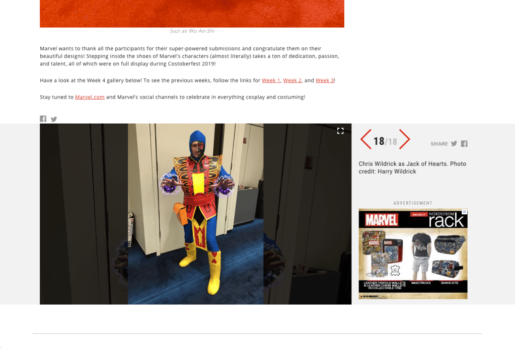 Finally, connecting my cosplay and overall fandom work, I submitted my Jack of Hearts costume to Marvel’s Costoberfest 2019 online cosplay contest and had it featured in week 4.