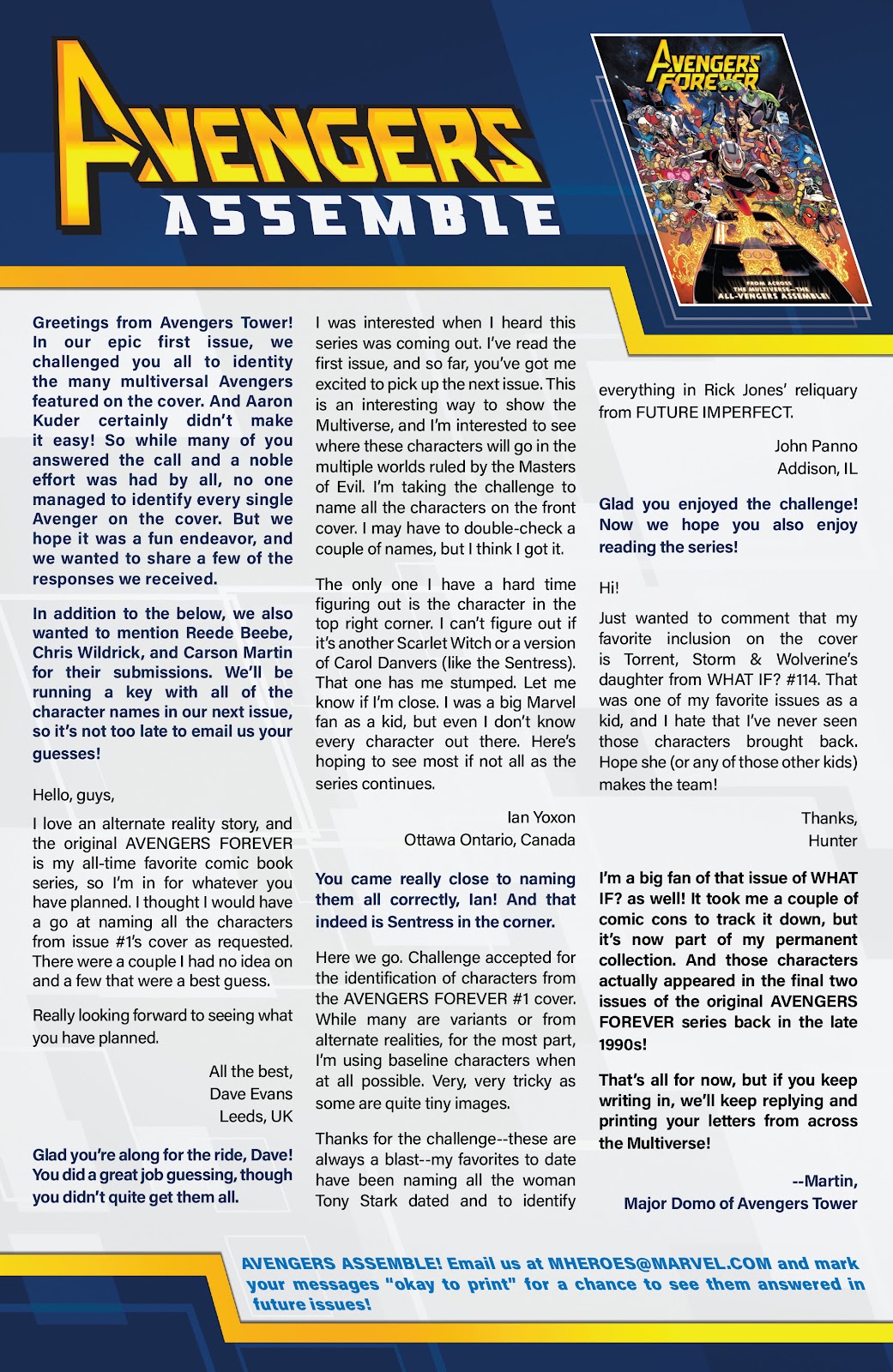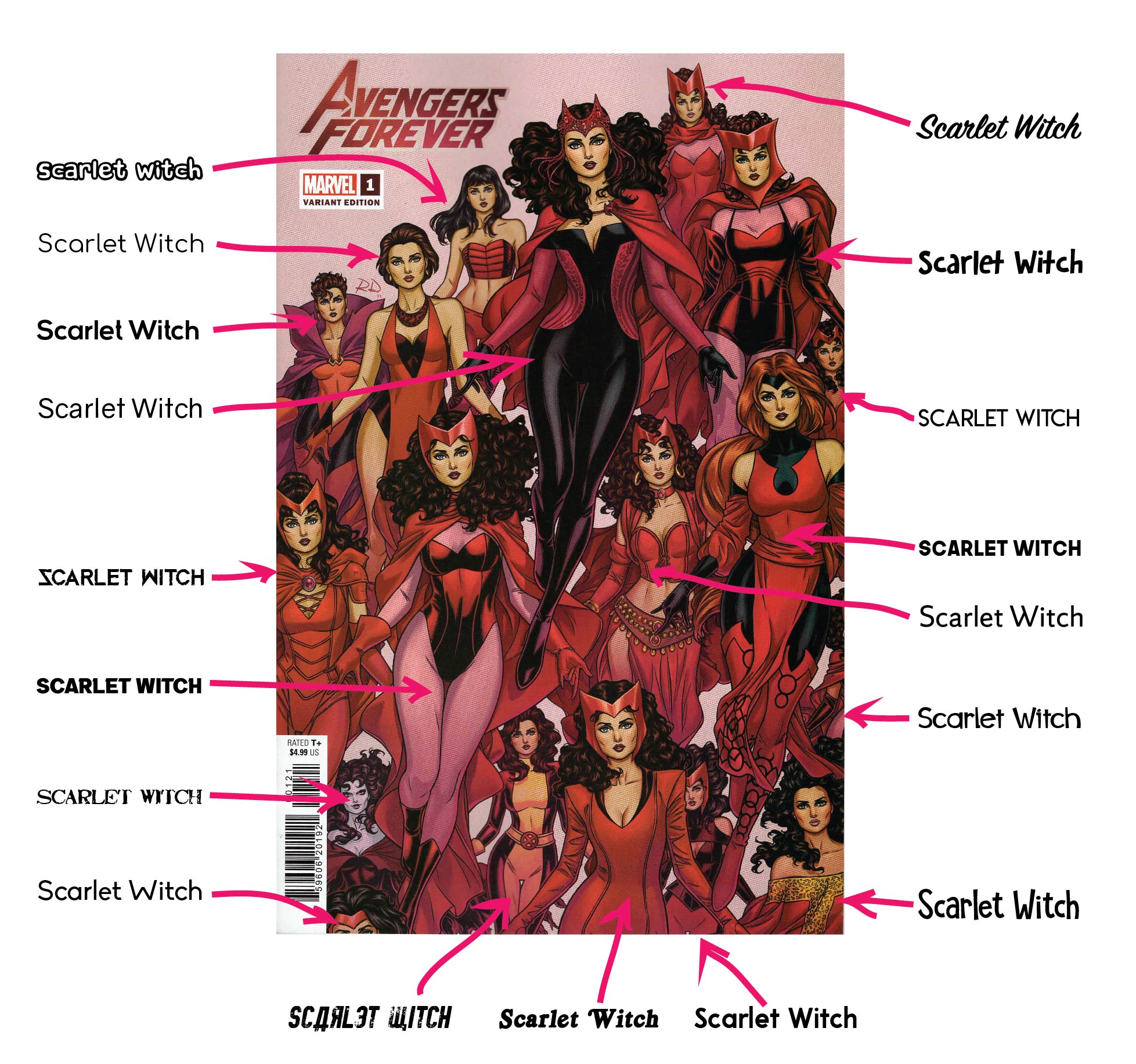 I was also given a special mention in Avengers Forever vol. 2, #4, for a contest to name all the characters on the cover. (I had jokingly used a variant cover that displayed numerous costumes for the Scarlet Witch, so I just sent in a diagram noting all the instances of the Scarlet Witch on the cover. Both that letters page and my diagram are included below.)