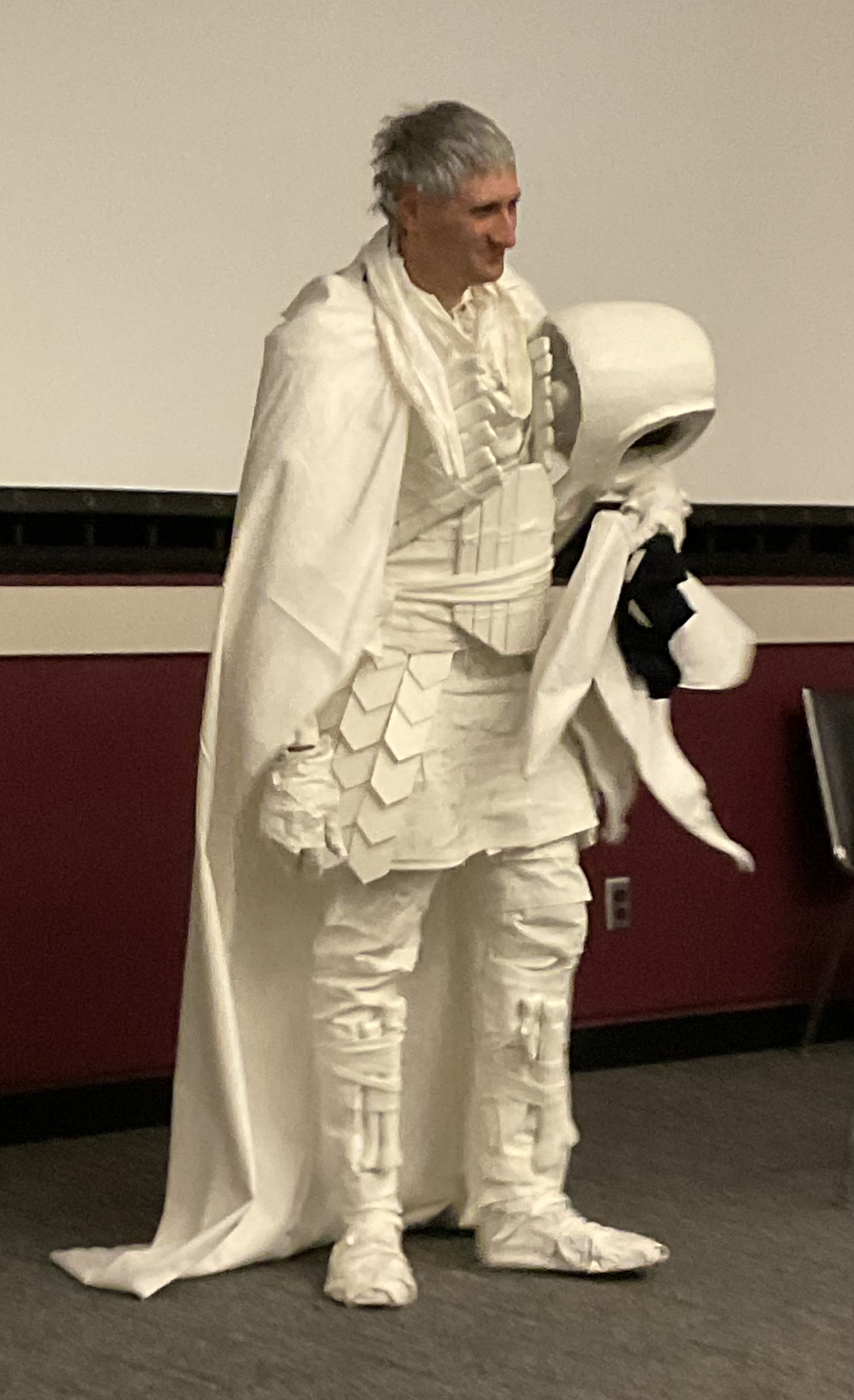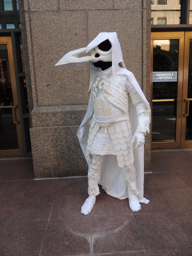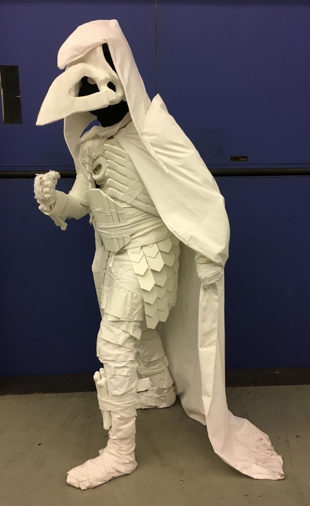 This was probably my most ambitious project yet. Some challenges included figuring out scale mail, creating eye coverings that look opaque white from the outside but you can see through from the inside, and carving that bird skull out of insulation foam. Also, capes and hoods: not as easy as you would think!