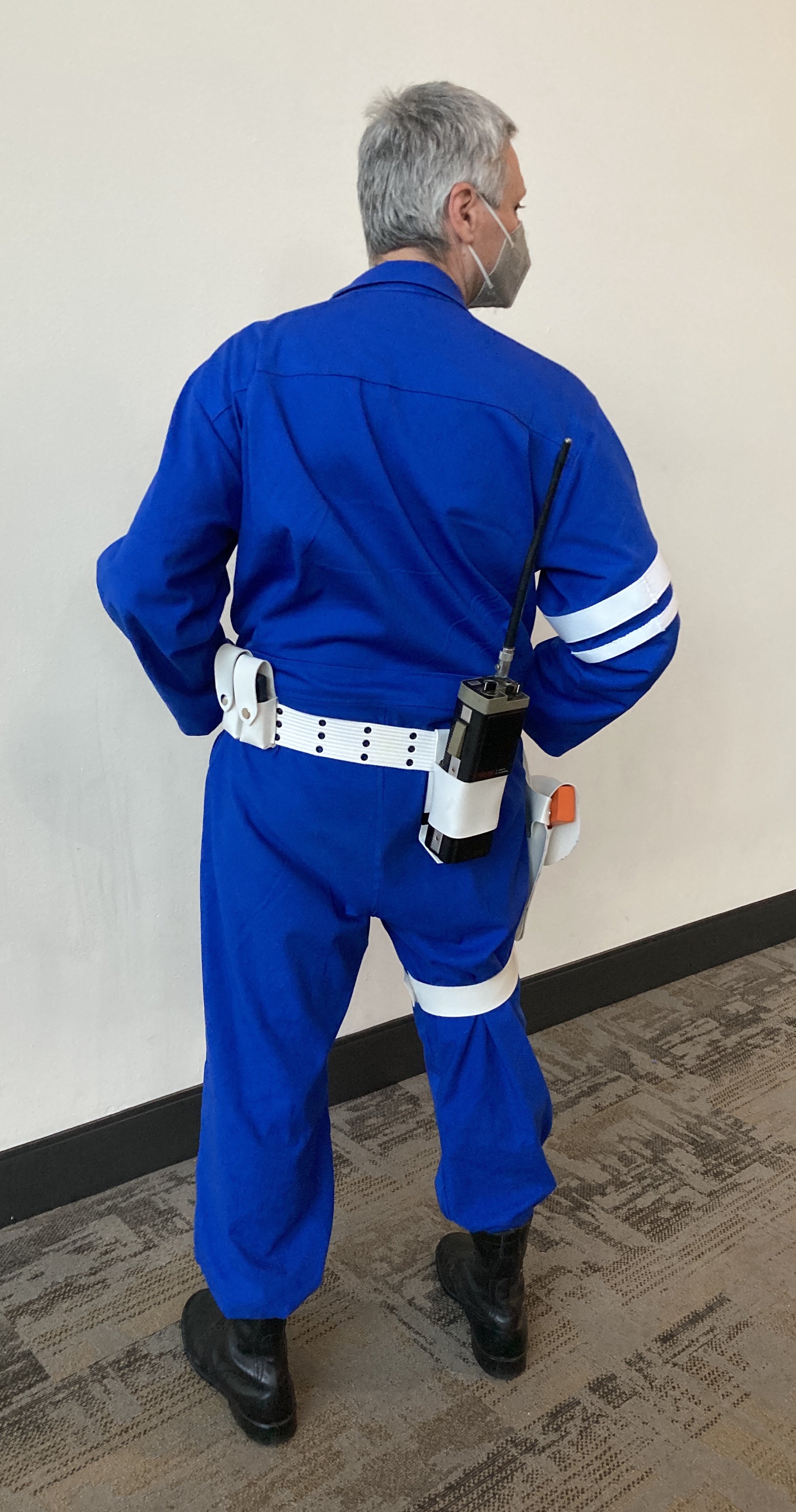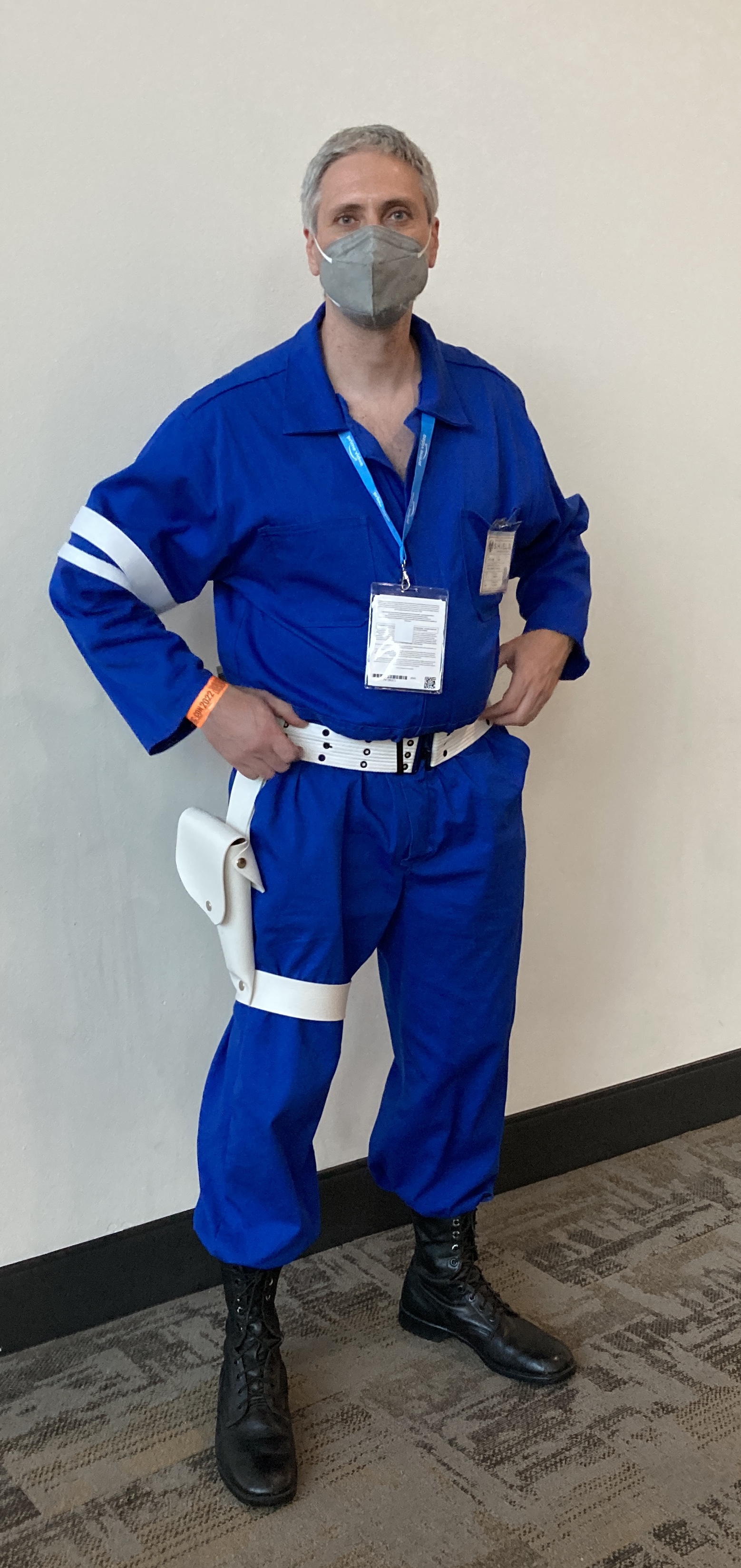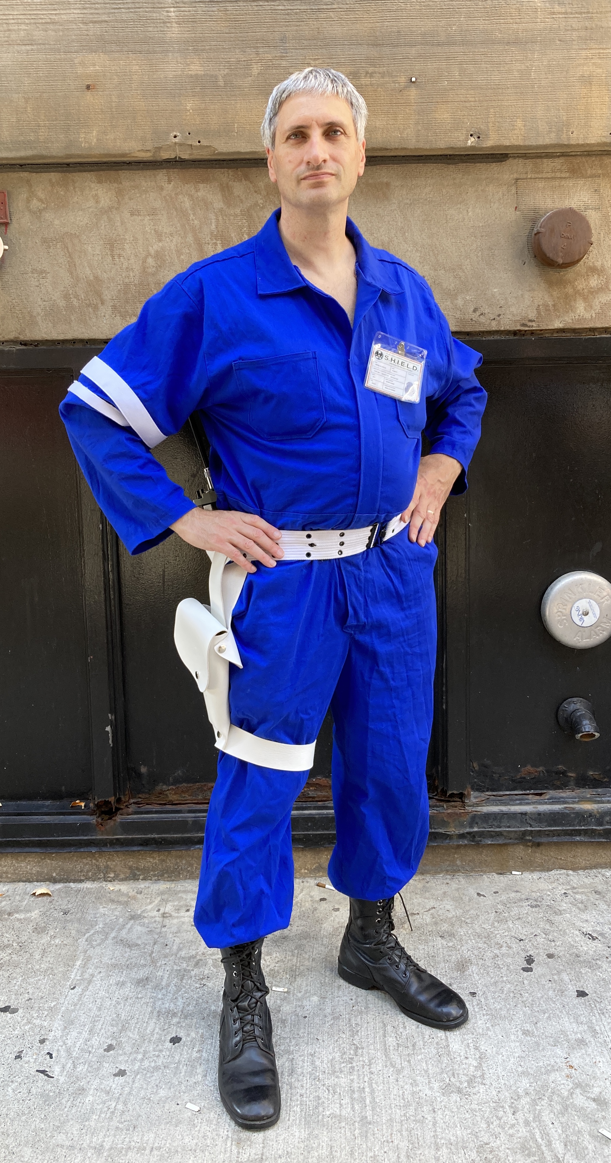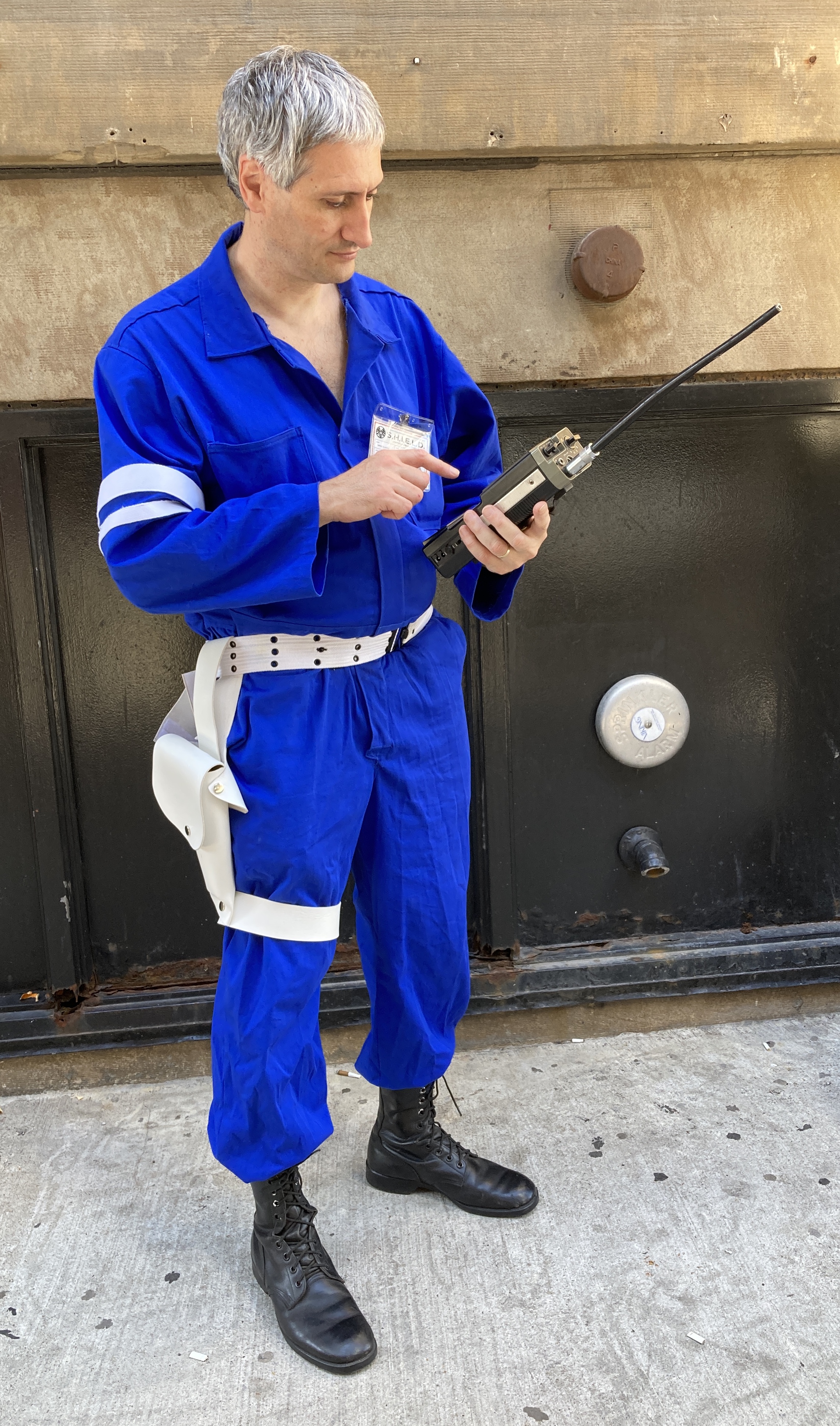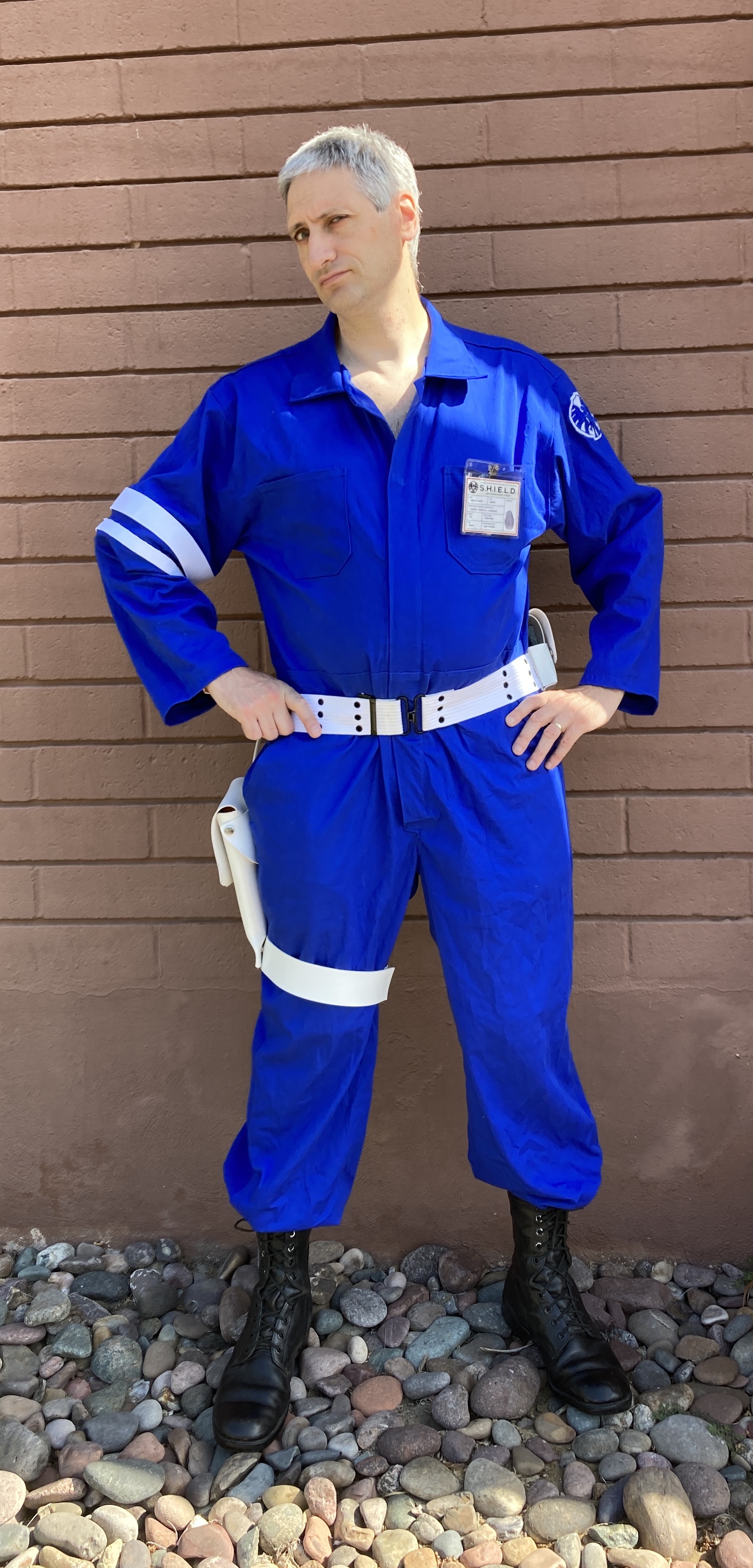 I sewed the jumpsuit (using what I think is actually the same commercial pattern that the show’s costumers used) and created the holster, foam pistol, pouches, radio strap, and ID card. My wife embroidered the S.H.I.E.L.D. patch. The pouches would probably hold ammunition for the pistol but this was never shown so I engaged with a little creative license and instead put little chunks of craggy black material in each, which are supposed to be chunks of the Kree Monolith that could send people to another planet. The Coulson LMD of the ’70s didn’t actually have slivers of the Monolith, it’s just a fun Easter Egg/conversation piece if someone happens to ask me what’s in them; I like the idea that somehow Coulson would still be carrying some of it around for an emergency. The boots, central belt, and ’70s-era walkie-talkie were purchased.