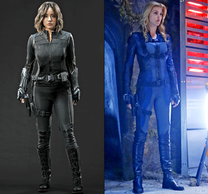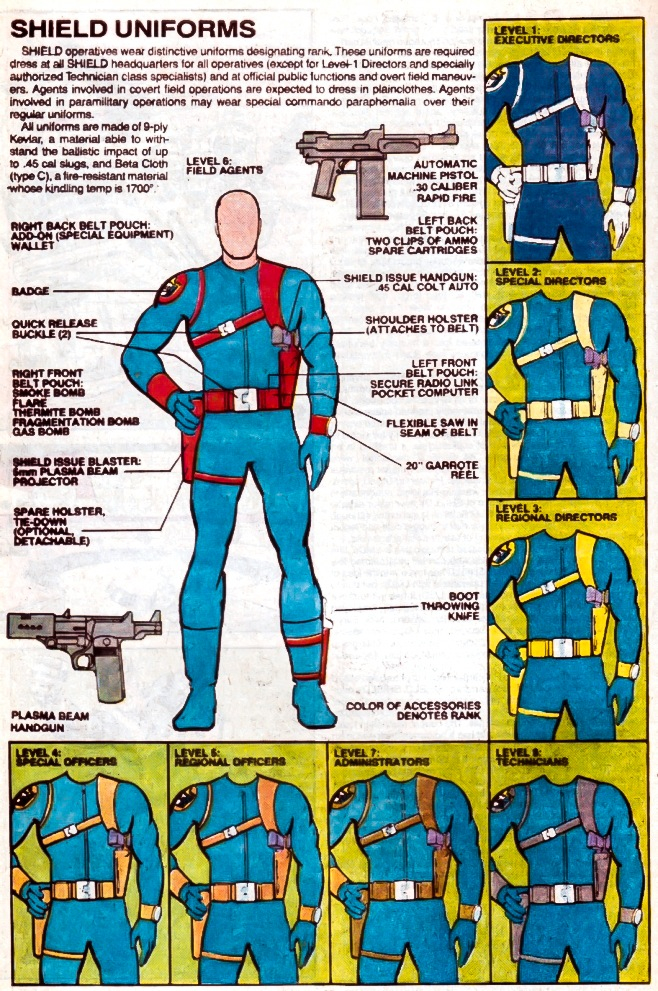 These uniforms are based on the original comics design for S.H.I.E.L.D. agents and intentionally look cheap and hilarious in a presumed comment on the popular conception that comics costume designs don’t translate well to the screen.