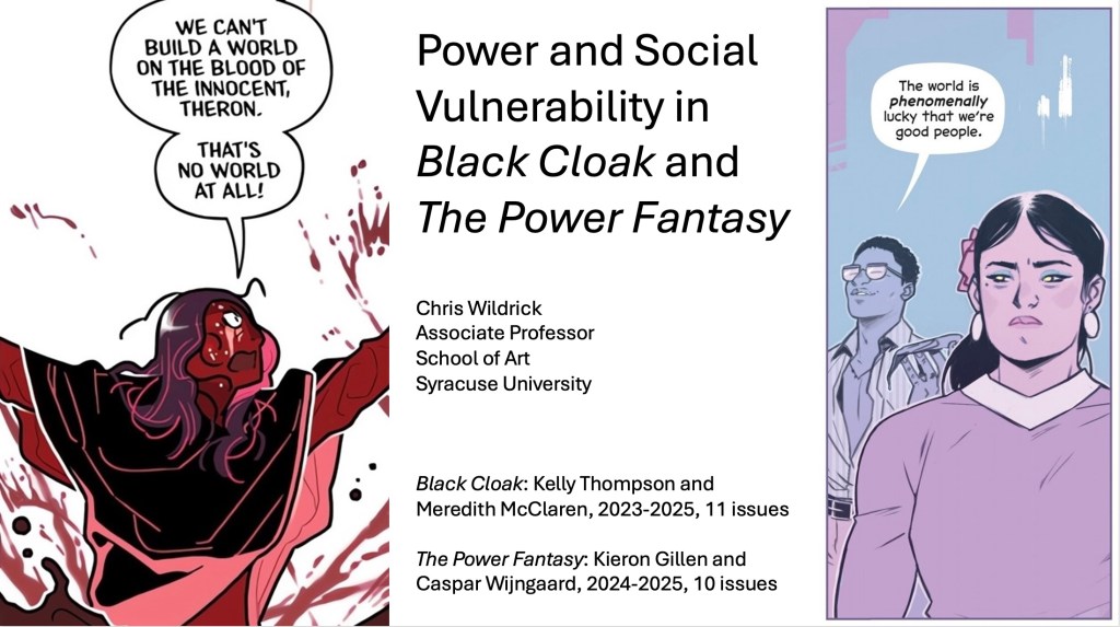 This is a talk I gave at the Comic Studies Society in 2025 about questions of ethics, justice, and power, especially as they relate to social vulnerability, in the Image comics Black Cloak (Kelly Thompson and Meredith McClaren, 2023) and The Power Fantasy (Kieron Gillen and Caspar Wijngaard, 2024).
