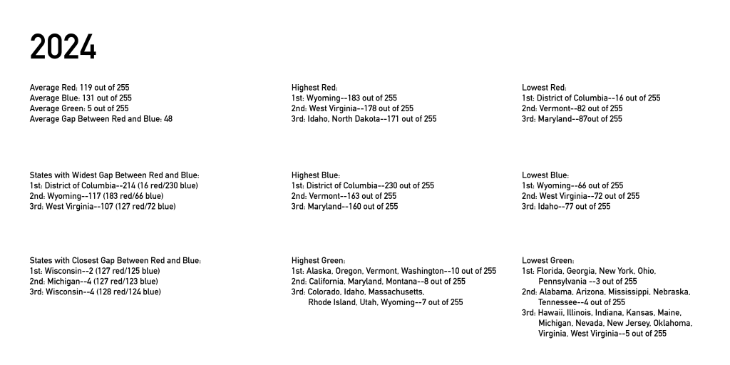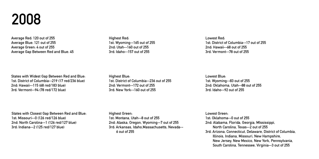 The full data set for each election, including each state’s popular vote and the formulas I used to convert them into RGB color space, can be found here: 2008, 2012, 2016, 2020, 2024. Again, I used Wikipedia as a source for these numbers: 2008 entry, 2012 entry, 2016 entry, 2020 entry. I used the American Presidency Project for 2024 because it lumped all the third parties into one group which is all I need for this project.