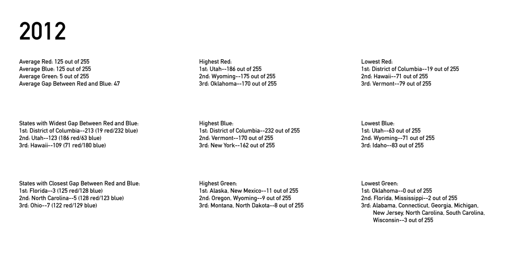 I made another map after the 2012 election. I altered my approach slightly, adding a third color for all the “independent” votes in each state, to make it an even better reflection of the range of voter ideologies. Since I created the original map using the red and blue color sliders in the RGB color tool in Photoshop, I now used the green color slider to represent all independent votes. It should be noted that the green color does NOT stand for the Green political party in particular. The color green stands for ALL “third party” votes, whether they are for the Green party, the Libertarian party, or anyone else. I could have broken down the independent vote by party, of course, but that would have required too many colors, and the colors wouldn’t have been at all discernable due to their low percentage of the vote. Even putting them all together, it is very hard to pick out their effect on the overall color mix (except for Utah in 2016, as you’ll see).