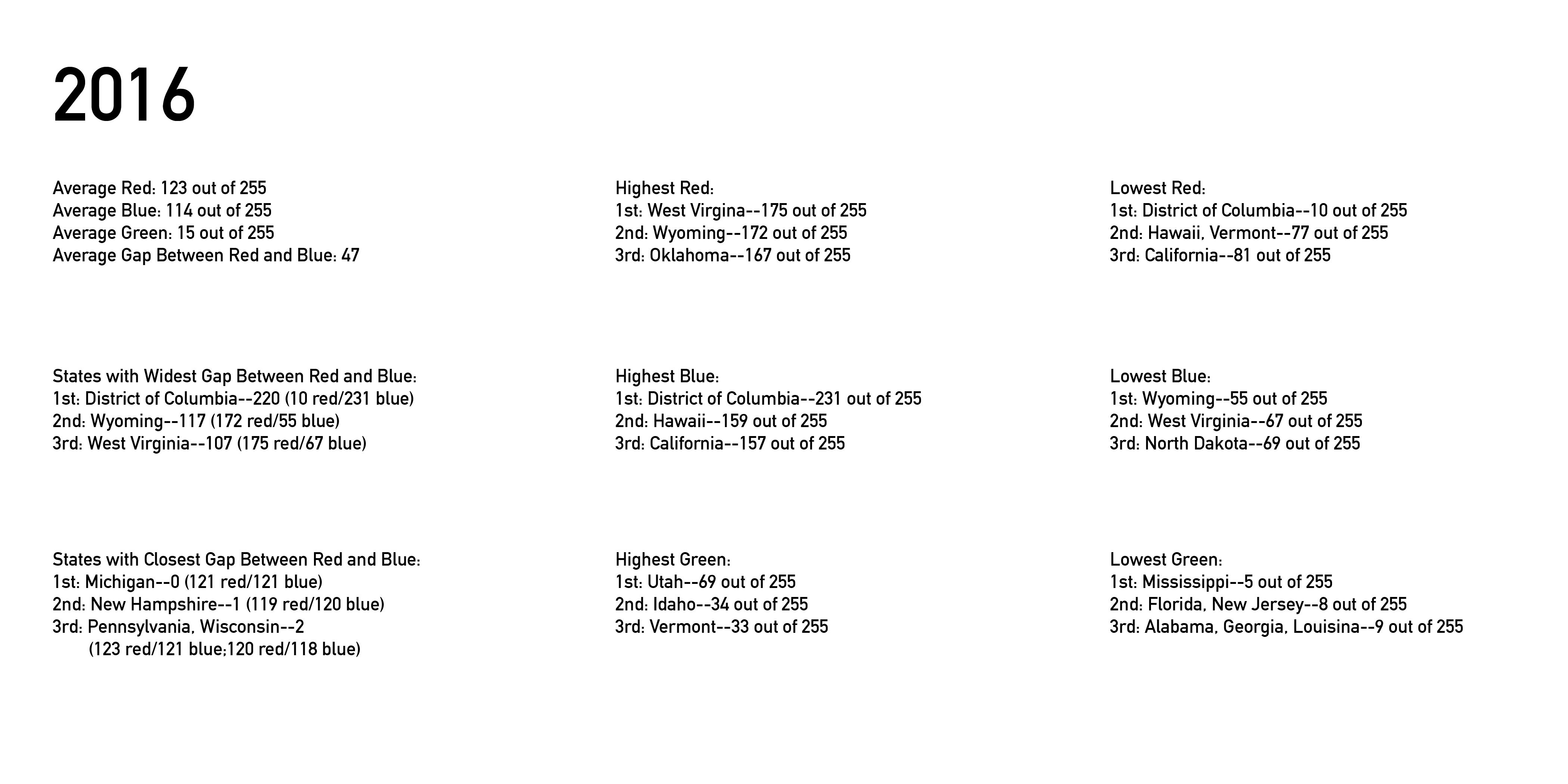 These slides show some of the basic top-level stats for each election, such as the average amount of each color per election, the average gap between the colors, etc.