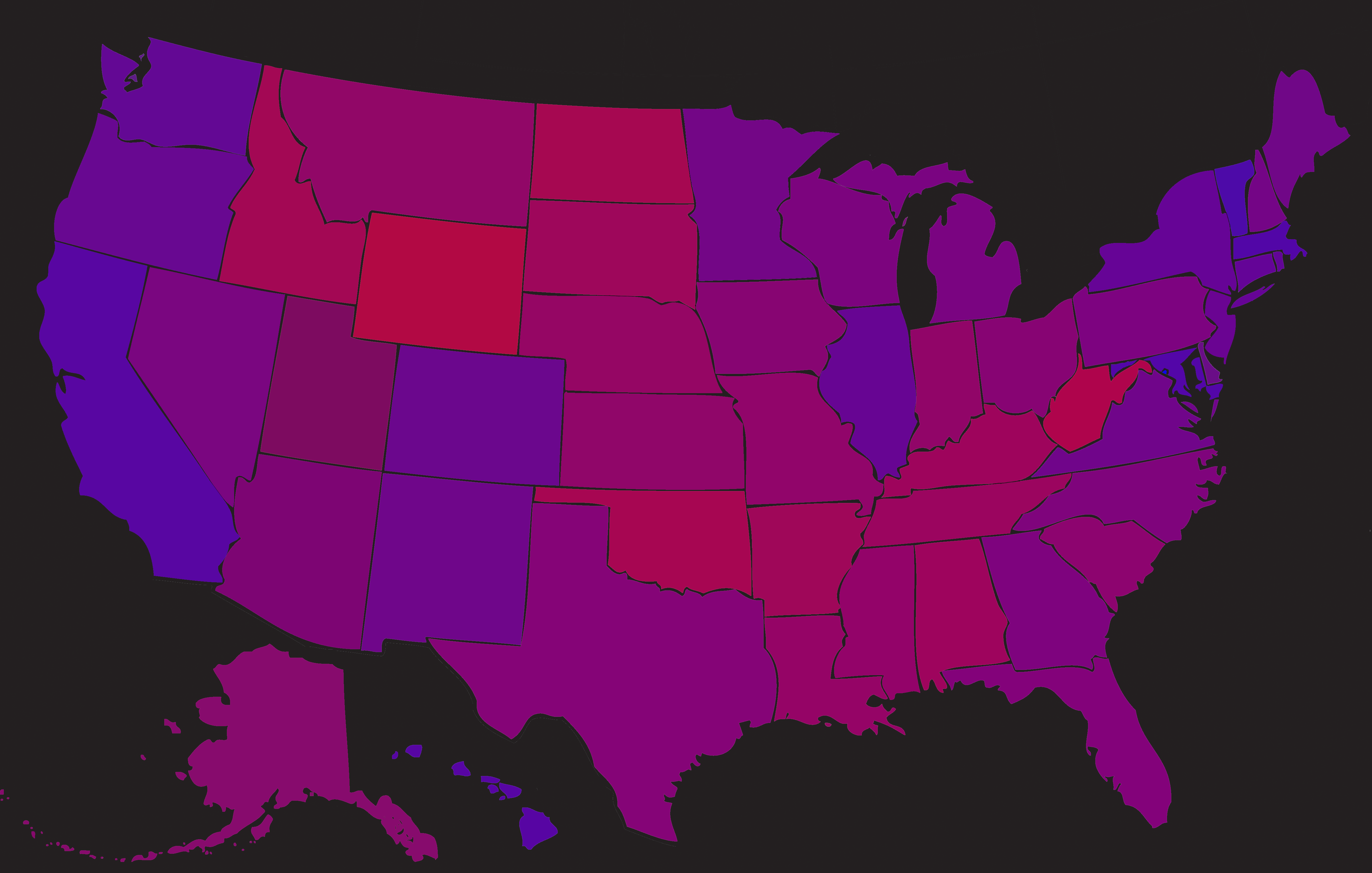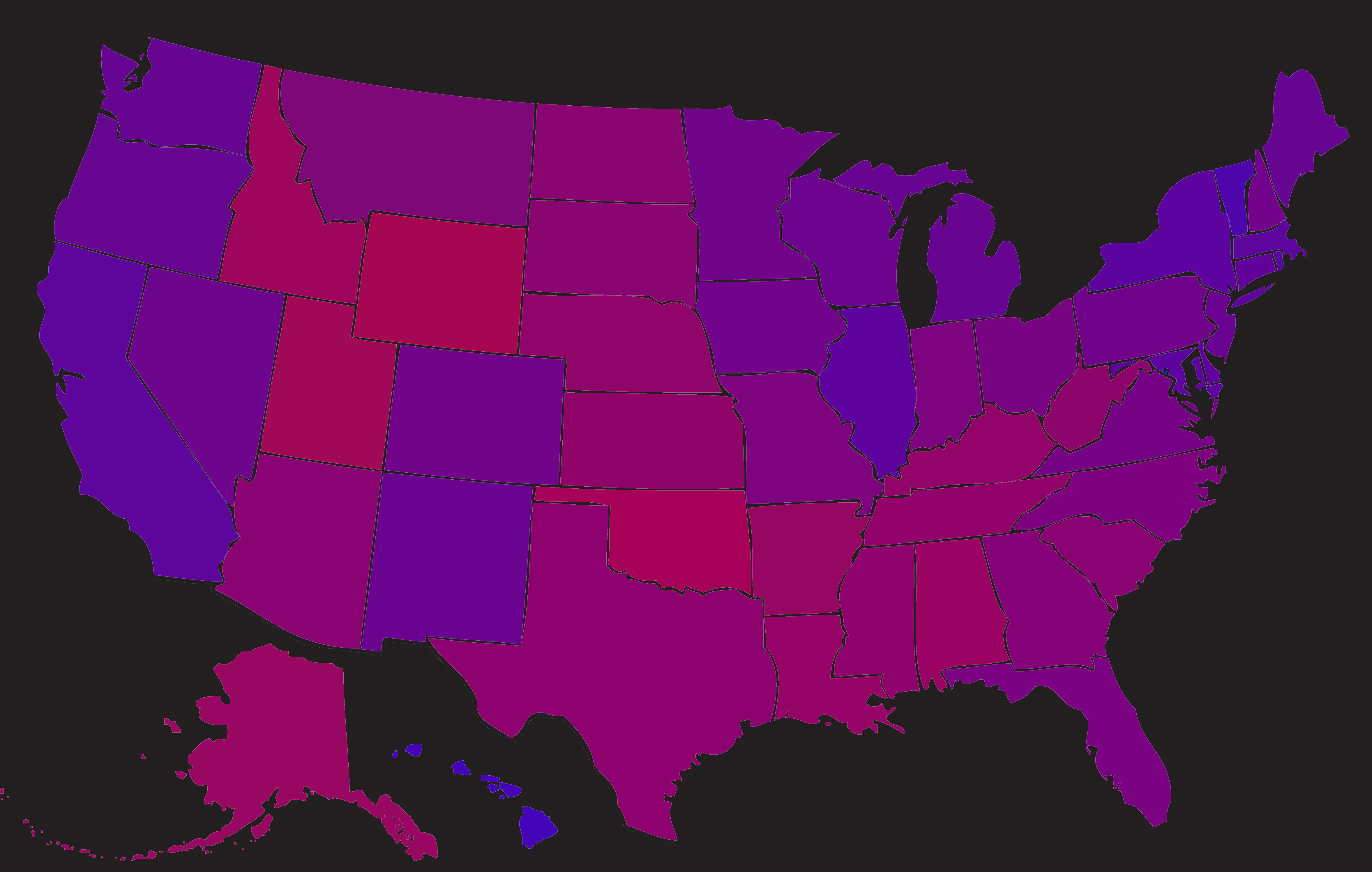 I colored each state a shade of purple based on results of the popular vote in that state. Purple, of course, is made by mixing red and blue. I took the percent of people in any given state that voted for the Democratic party, and made that the percentage of blue that was in the purple; and I took the percentage of people that voted for the Republican party, and made that the percentage of red that was in the purple.