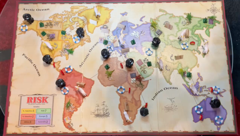 Earl created a new cooperative game to play using a Risk board and cards, but with new player pieces and new rules.