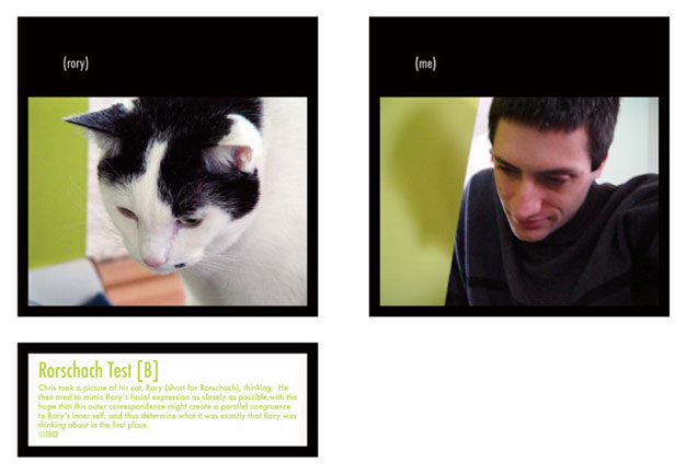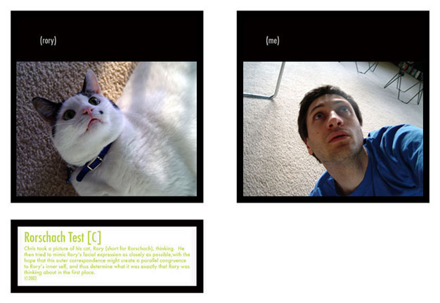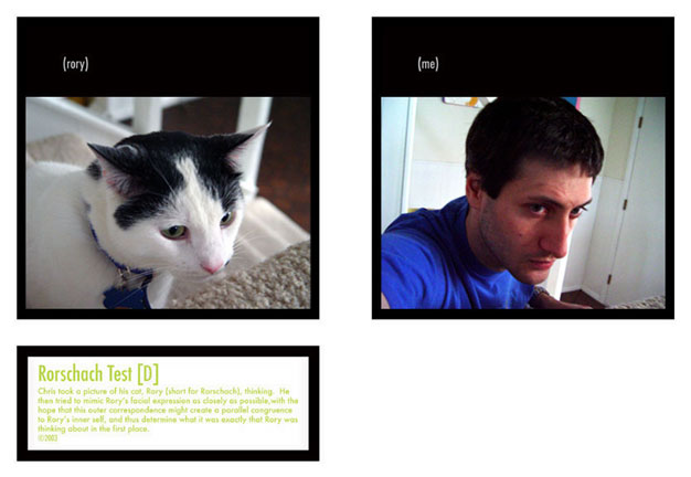 I took a picture of my cat, Rory (short for Rorschach), thinking. I then tried to mimic Rory’s facial expression as closely as possible, with the hope that this outer correspondence might create a parallel congruence to Rory’s inner self, and thus determine what it was exactly that Rory was thinking about in the first place.