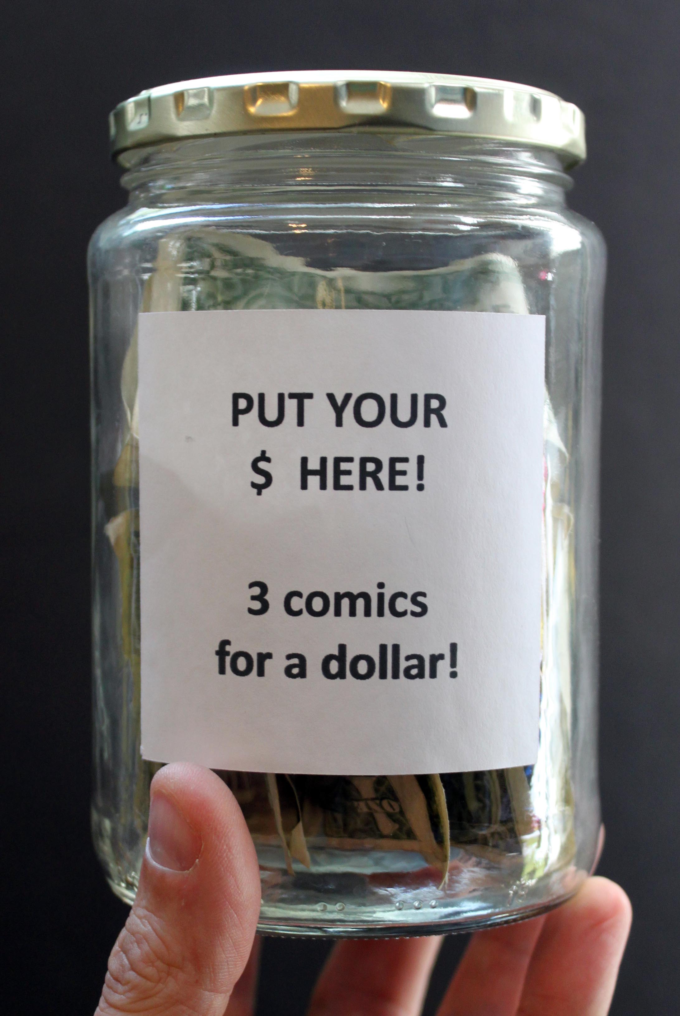 For the fist project, Satellite Store, I borrowed a box of comics from Cloud City, with their permission. The comics were all random old, unpriced back issues that had not yet been sorted into Cloud City’s various sales sites. We took out all the really rare and expensive ones, but there were still plenty of pretty good issues in there. I put them in a gallery exhibition and put them up for sale for 3 comics for a dollar–much cheaper than they would be in a store. The goal was to see if standard gallery viewers would check out some comics if they were sold for rock-bottom prices. I sold 39 comics over the length of the show, making $13. I split the money evenly with Cloud City.
