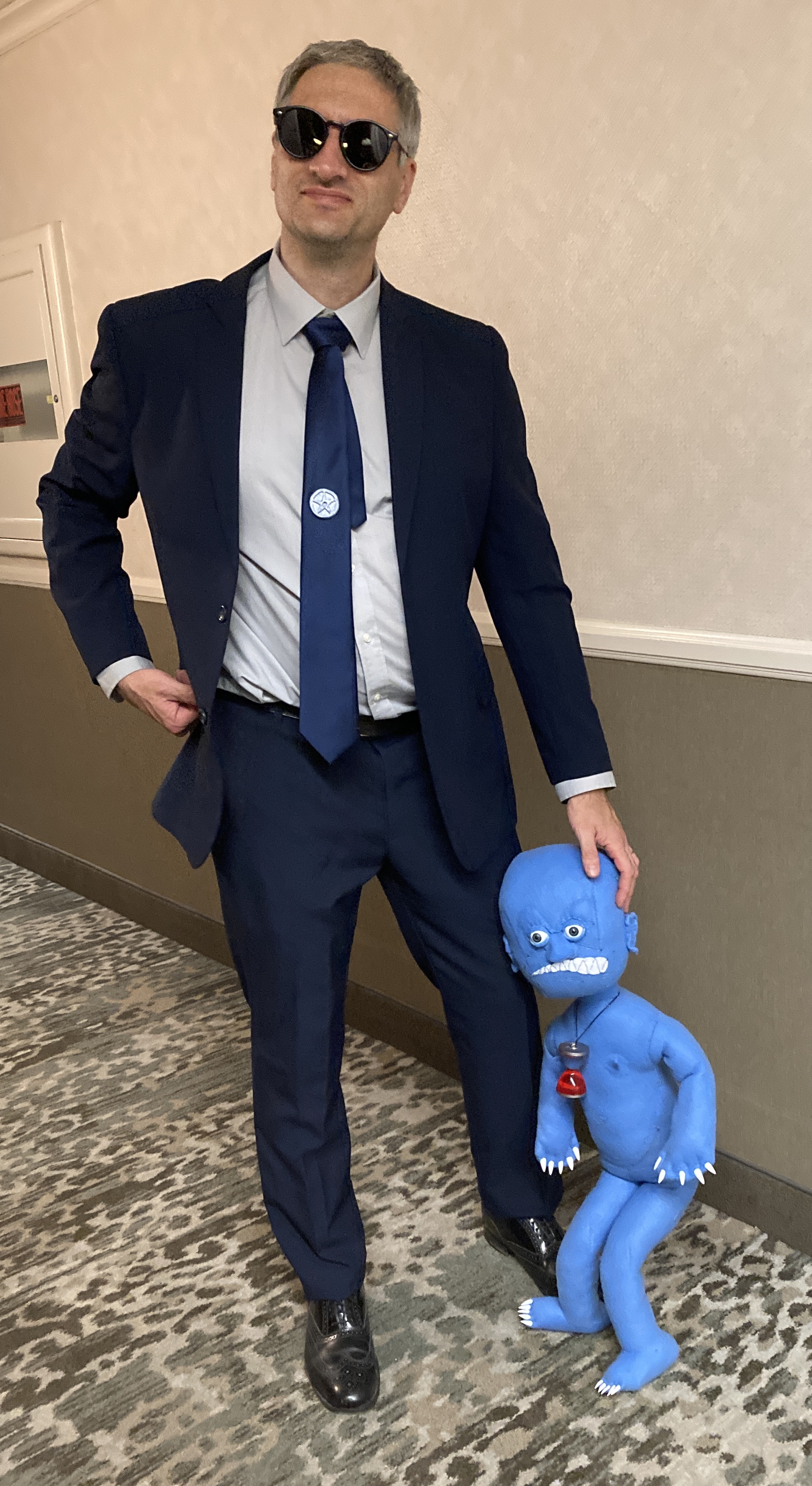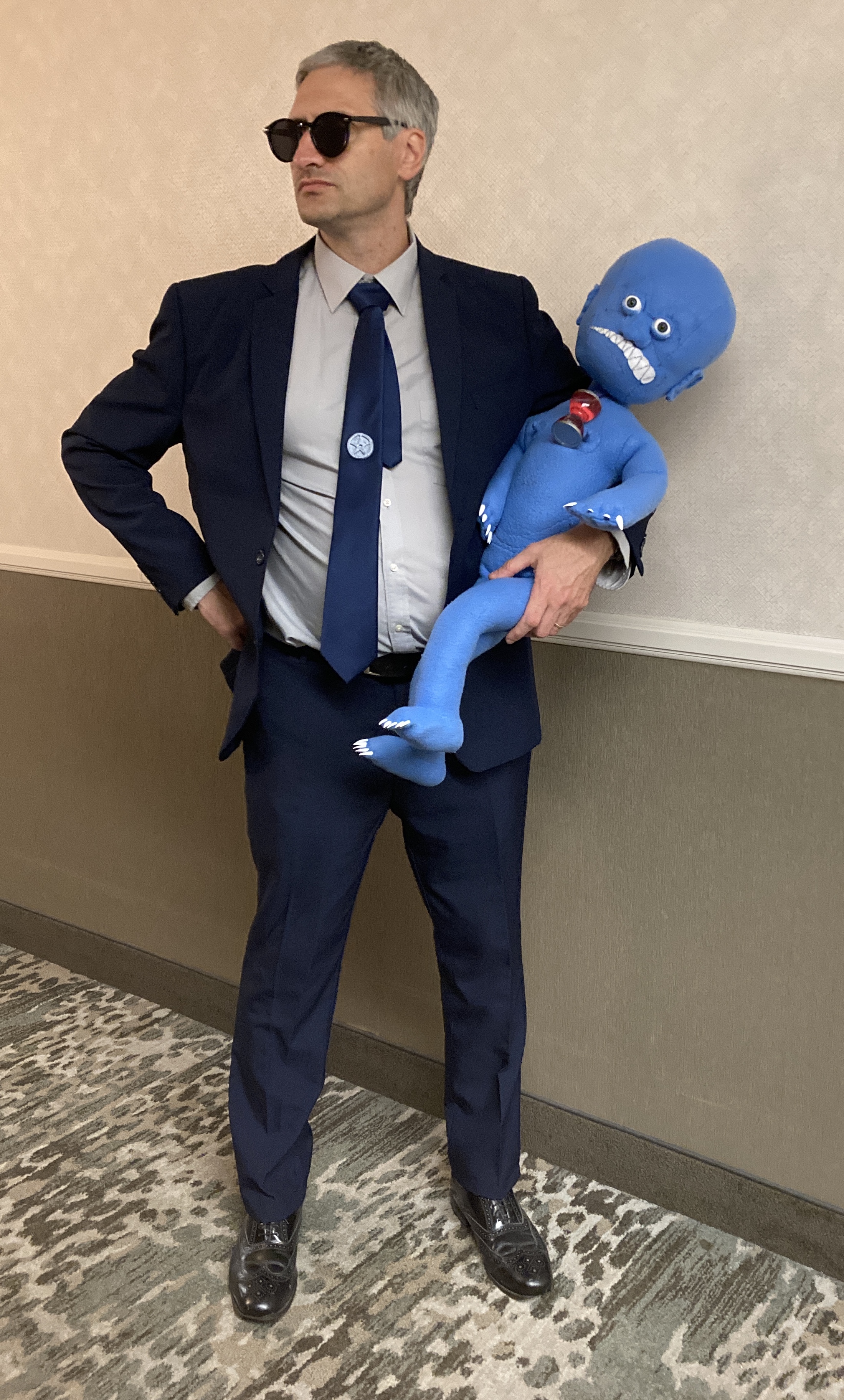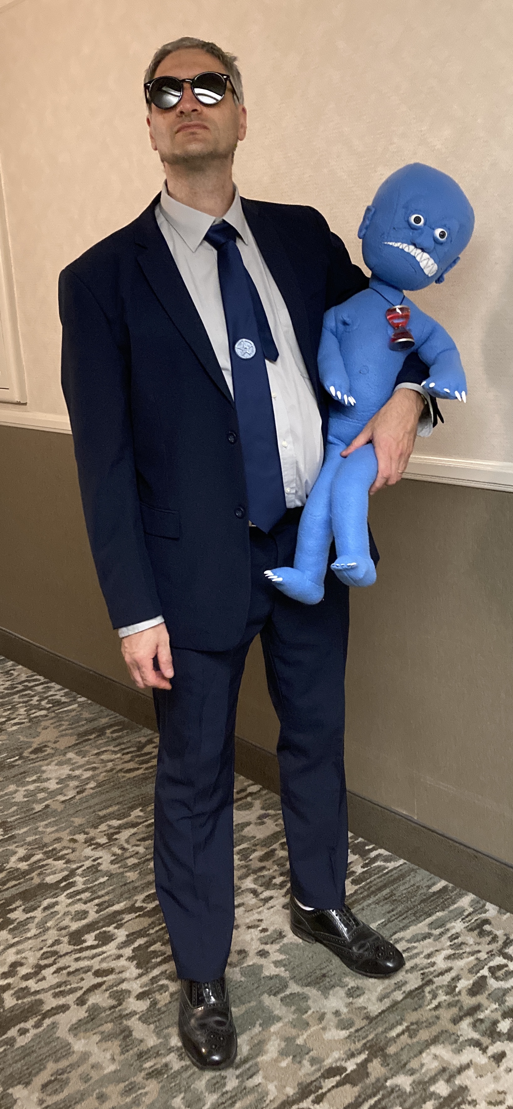 In terms of versions of Sir Timothy, there are a few: the version in the future, who wears a single-breasted dark blue suit; the version in the past who is homeless, whose suit is tattered; and the version in the past after he breaks out of Barbatos’s illusions and takes back his power, who wears a double-breasted bright blue suit. I am wearing the original future version, with a single-breasted dark blue suit, a pentagram tie tack, and an off-white (kind of tan-grey) shirt.