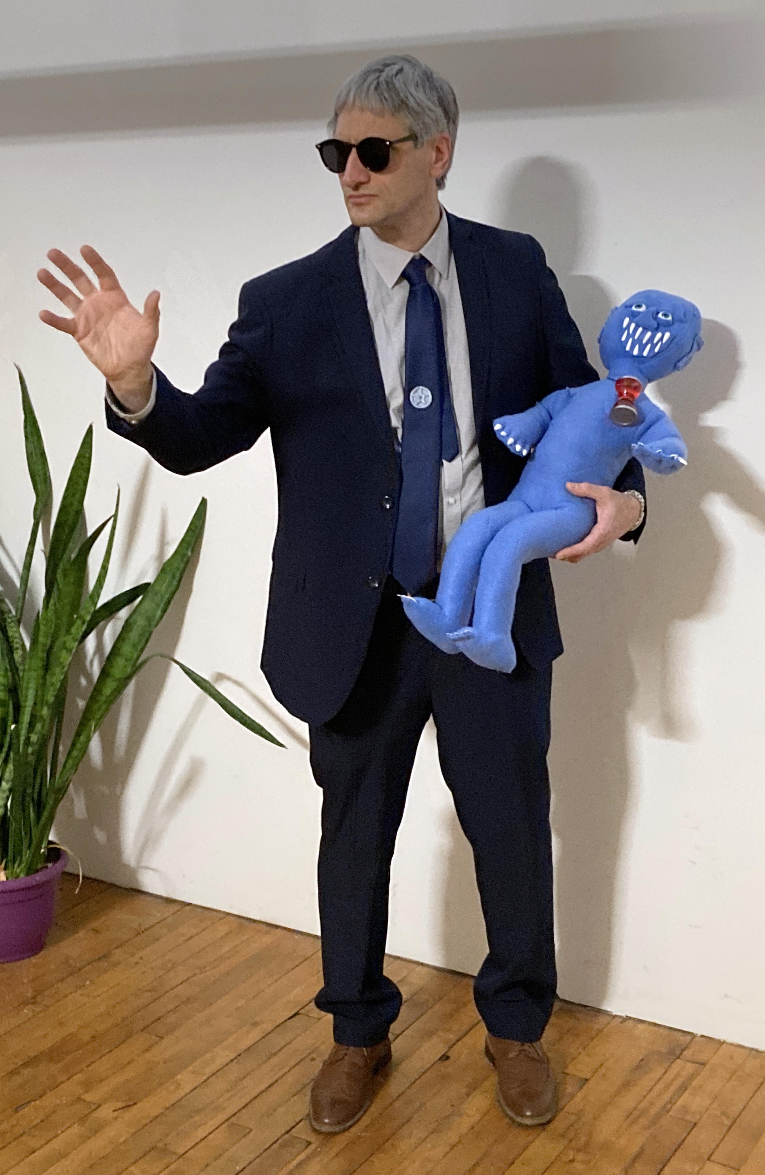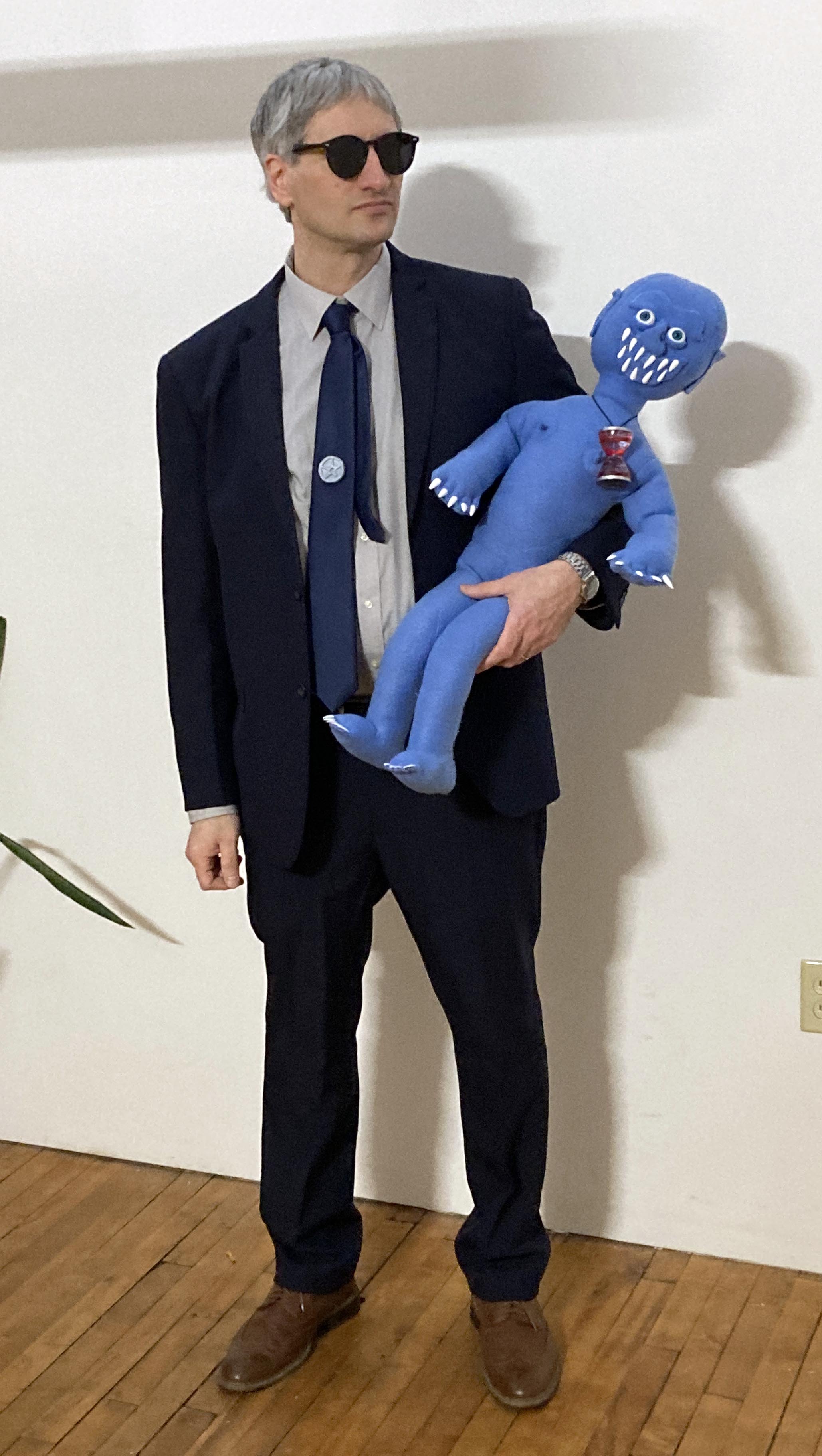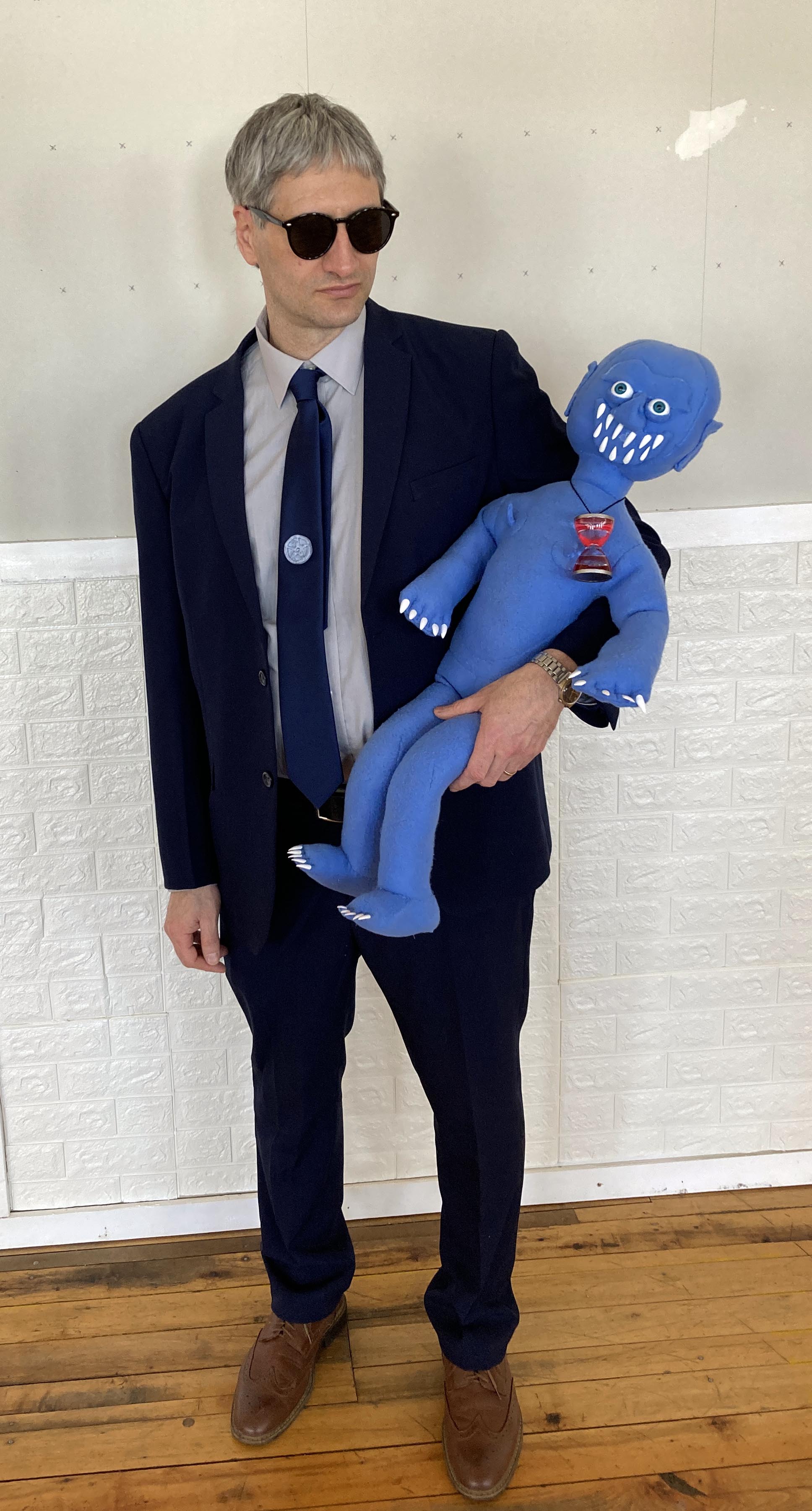 In terms of versions of Sir Timothy, there are a few: the version in the future, who wears a single-breasted dark blue suit; the version in the past who is homeless, whose suit is tattered; and the version in the past after he breaks out of Barbatos’s illusions and takes back his power, who wears a double-breasted bright blue suit. I am wearing the original future version, with a single-breasted dark blue suit, a pentagram tie tack, and an off-white (kind of tan-grey) shirt.