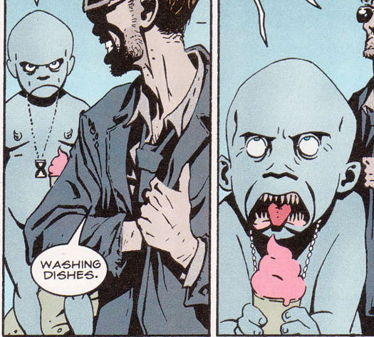 As it turns out, also fairly pathetic. Sir Timothy has a servant demon, Barbatos, who helps him rule the future. When Sir Timothy’s world starts to seem like it’s coming apart at the edges, Barbatos explains that it’s because Young Tim is no longer on the path to become Sir Timothy. So Sir Timothy goes back in time to deal with Young Tim. But when he does, it turns out that Barbatos has been manipulating him all along. At least in the past (and maybe the future as well?), Barbatos creates illusions that make it seem like Sir Timothy is living a grand life, but he’s really wearing a ratty suit and living in a cardboard box.