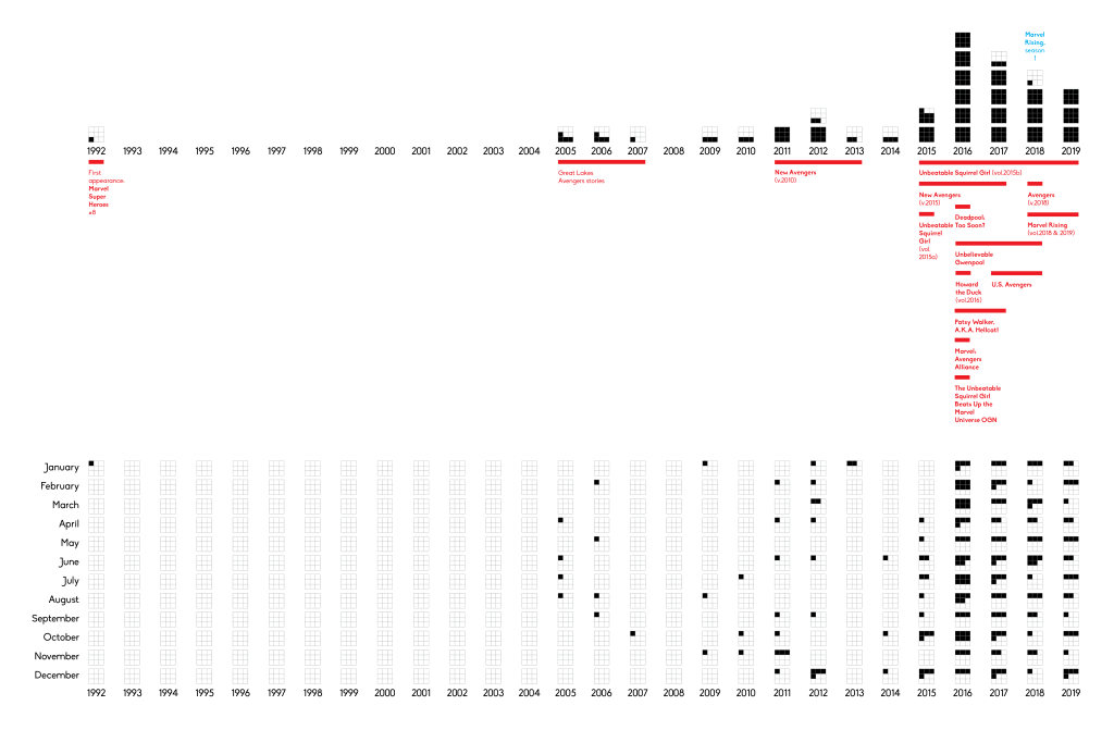 You can download the charts at the following links: Patsy Walker (Hellcat), Chuck Brown (Kite Man), Groot, Misty Knight, Mantis, Elektra, Julie Power (Lightspeed), Nimrod, Dwayne Taylor (Night Thrasher), Doreen Green (Squirrel Girl), Miguel O’Hara (Spider-man 2099), Victor Mancha. Also, this chart collects all of their annual appearances together for comparison’s sake.